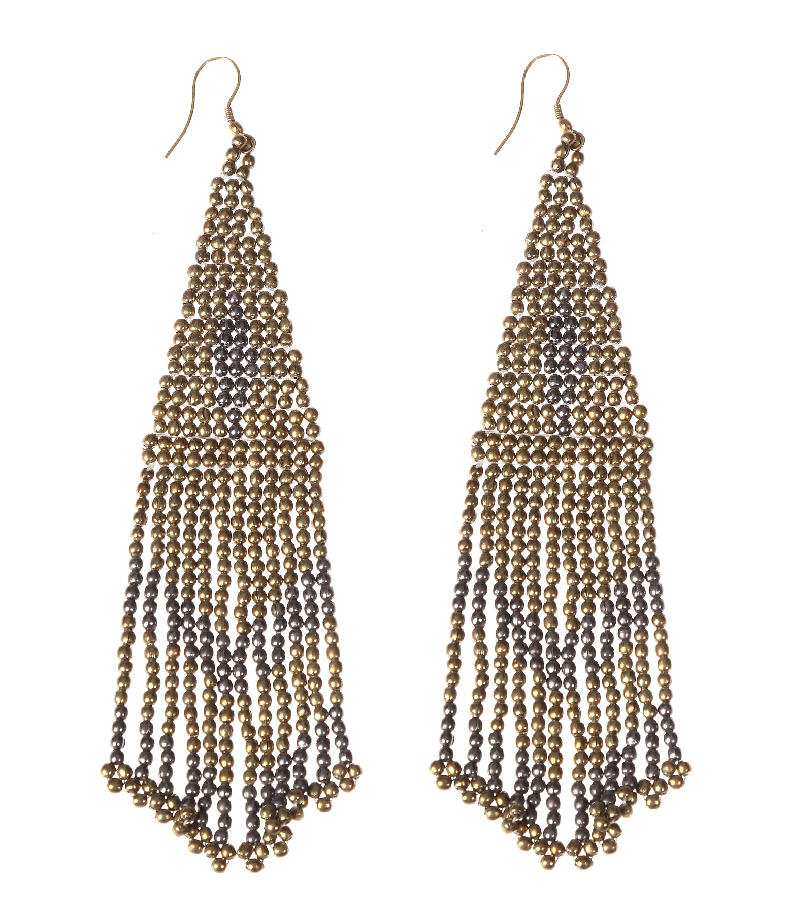 Boucles d'oreilles pendantes composées de perles de laiton coloris bronze, argent et argent noir.