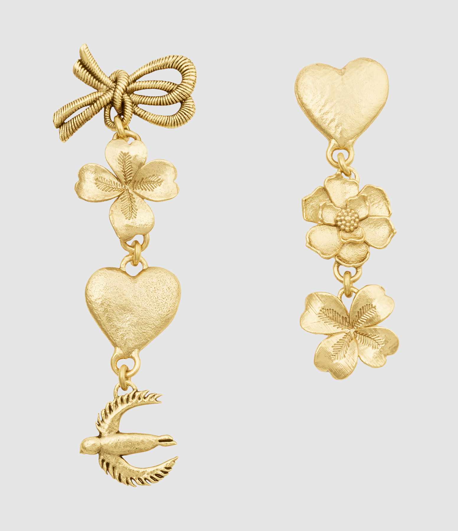 Boucles d'oreilles asymétriques en laiton doré, orné de talismans : le cœur, le trèfle, l'hirondelle... Fermoir poussette.