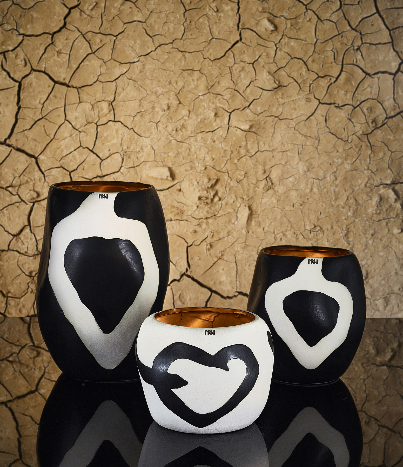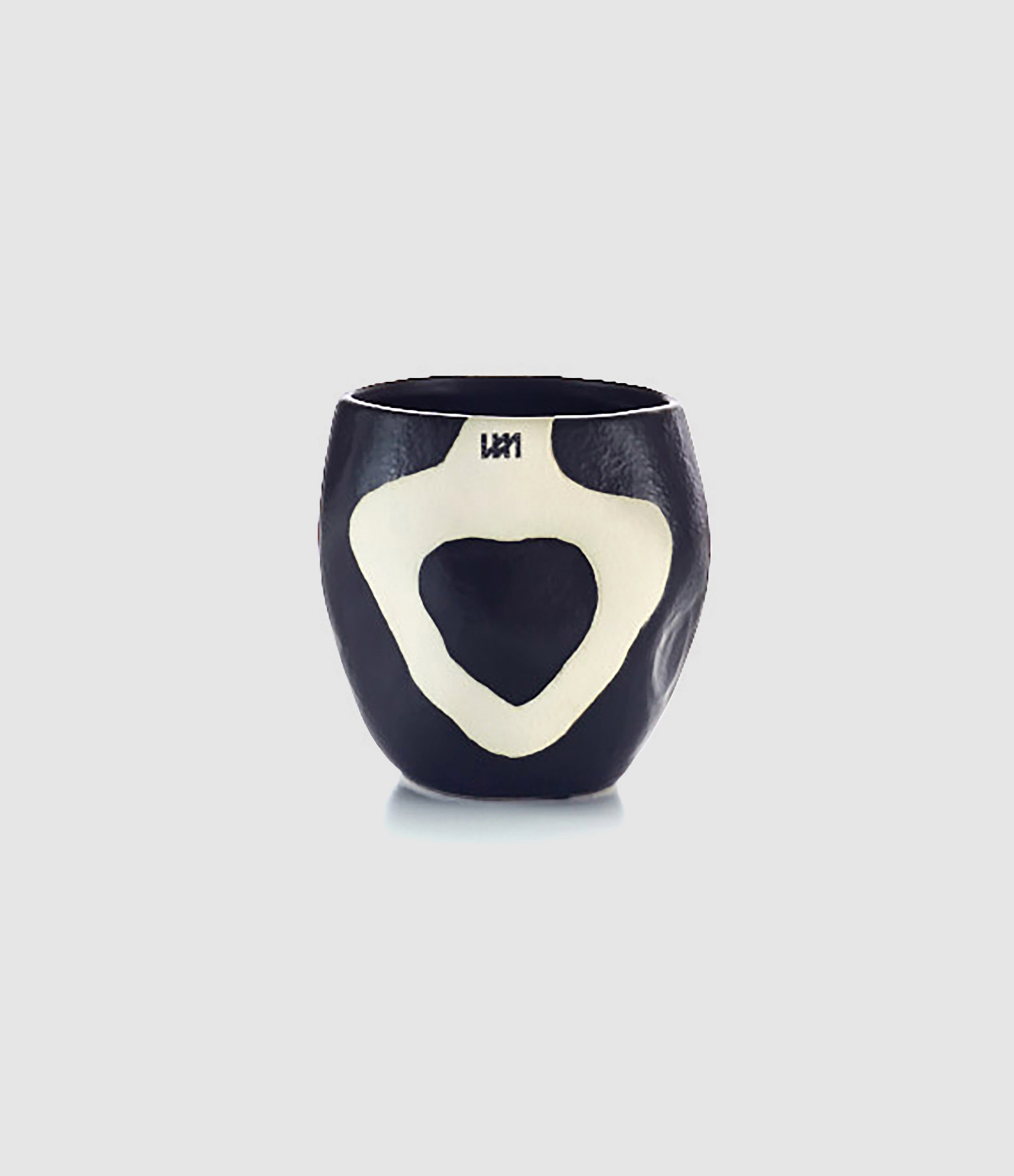 Bougie parfumée à trois mèches, en argile taillé à la main recouverte de peinture brute noire avec des dessins blancs.