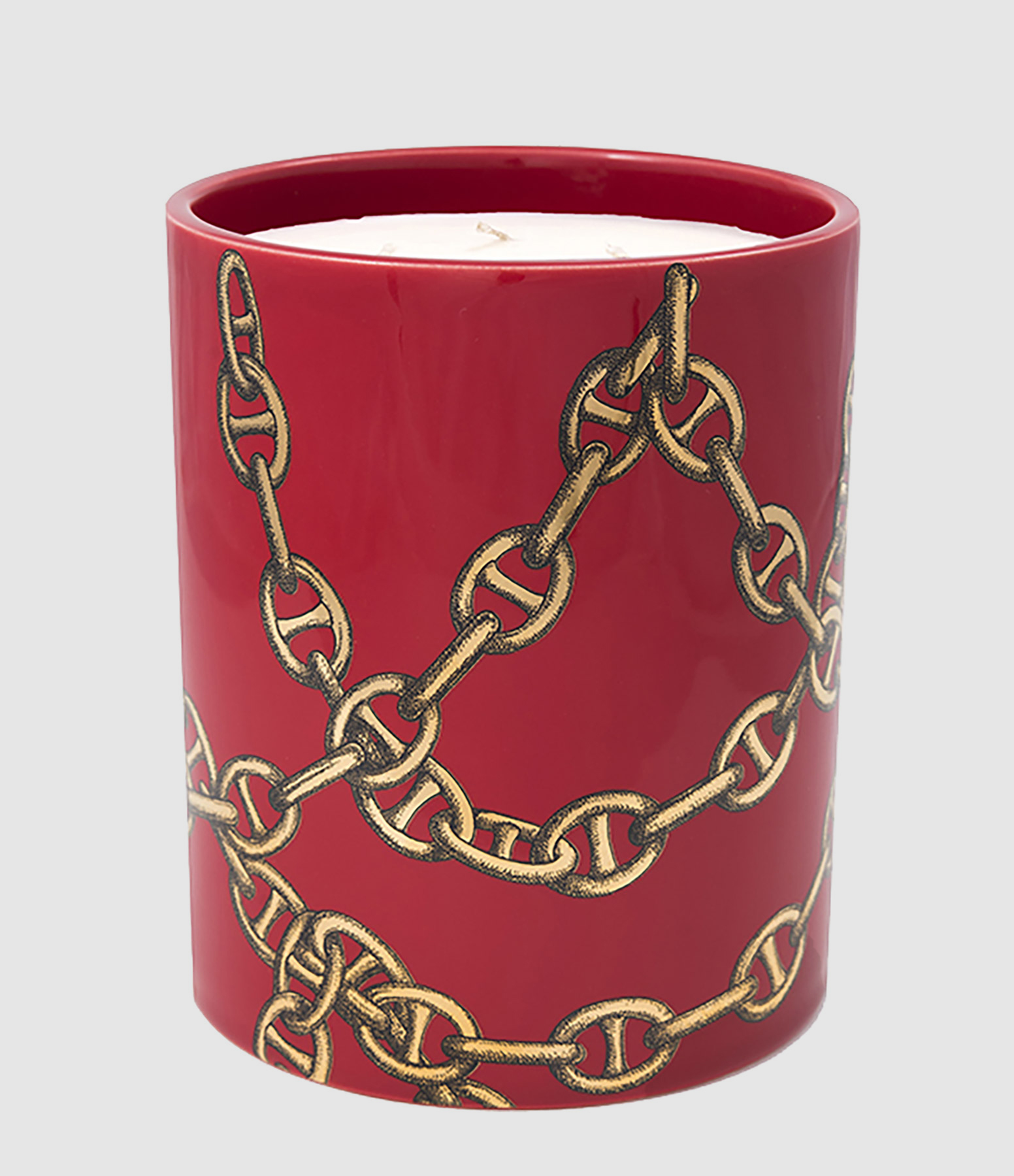 Bougie parfumée en porcelaine rouge et doré, peinte à la main. Design inspiré du décor "catene" imprimé pour la première fois sur un foulard de soie de Pierro Fornasetti en 1946. 1 mèche en coton pur bio-dégradable.