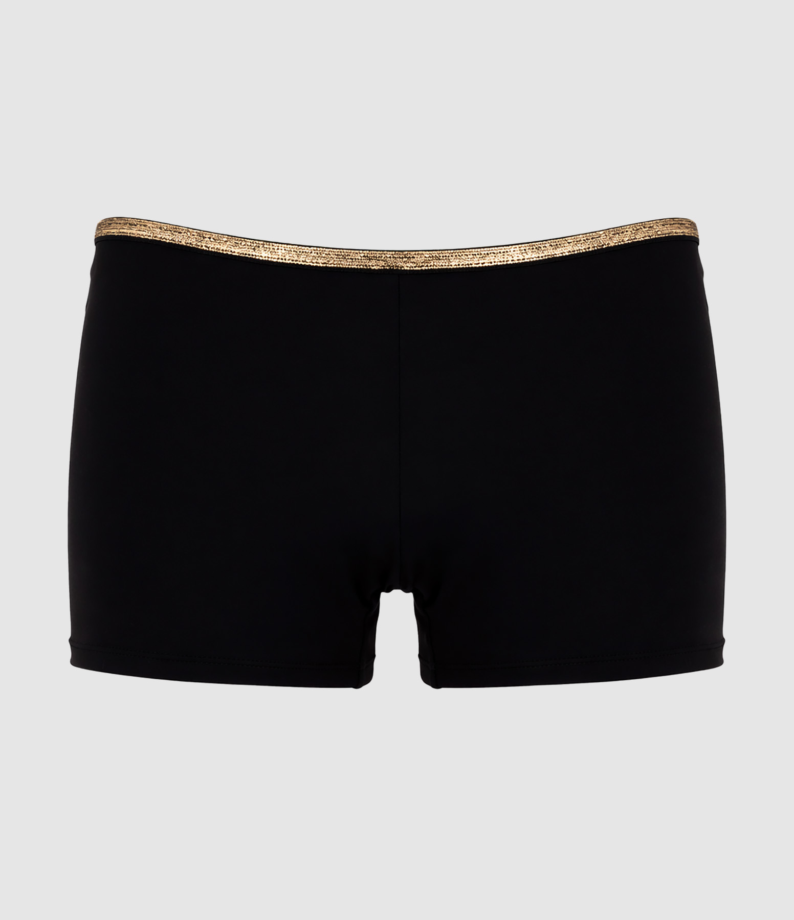 Boxer de lingerie. Short seconde peau. Couvrant sur les fesses. Elastique doré à la taille.