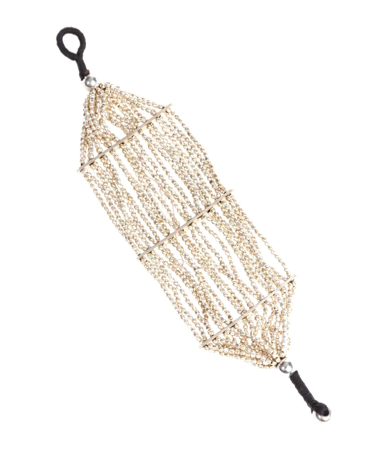 Bracelet composé de plusieurs rangs de perles en bronze ou argent noir, assemblés dans 3 baguettes. Fermoir par une grosse perle sur un lien en coton.