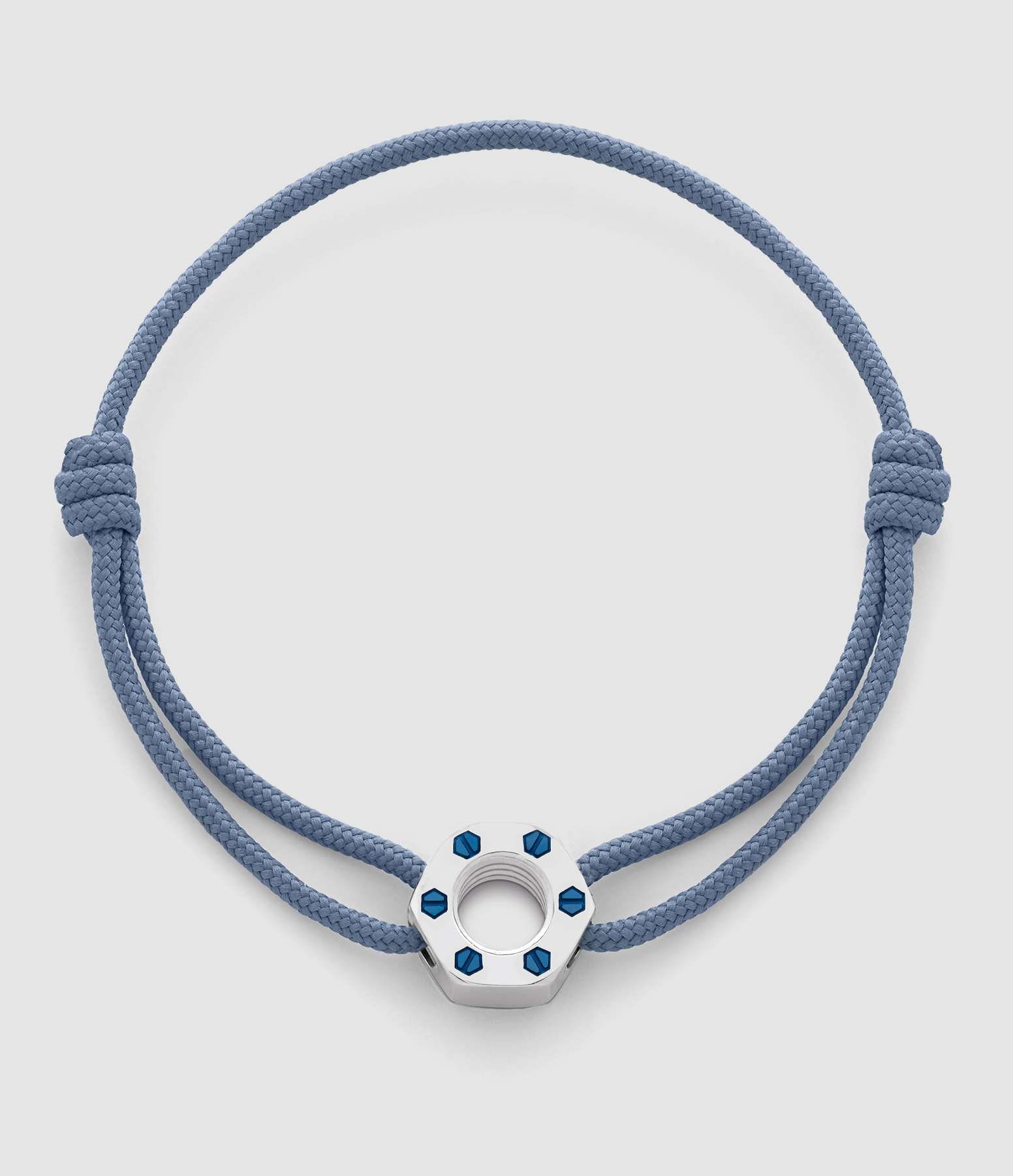 Bracelet sur cordon agrémenté d'un écrou en acier argenté et détails bleus. Cordon ajustable par nœud coulissant.