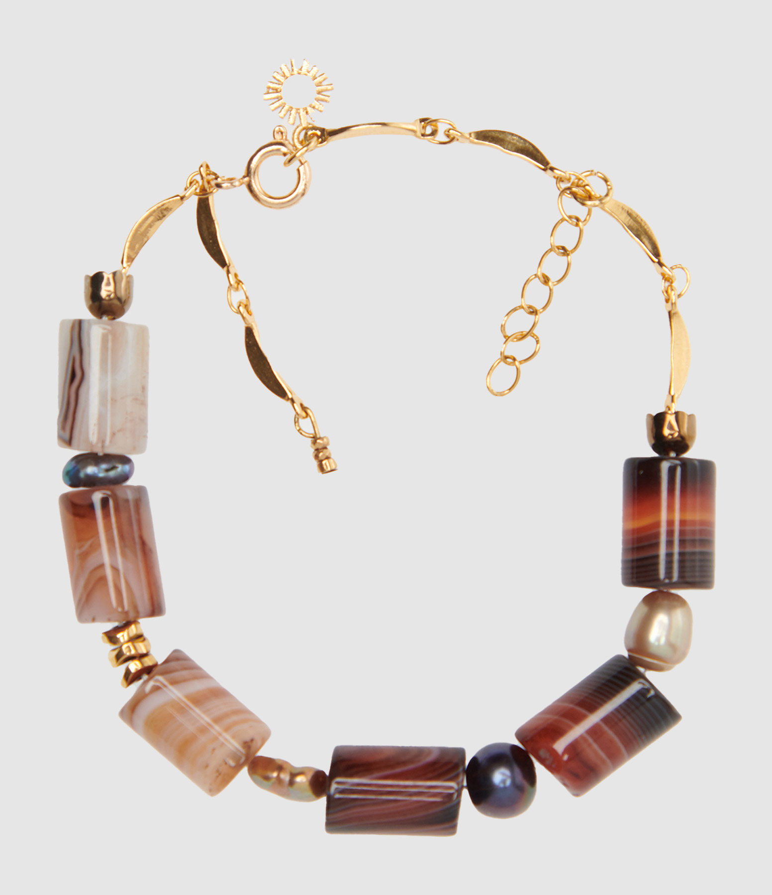 Bracelet en perles avec détails dorés. Fermoir à ressort avec chainette de réglage.