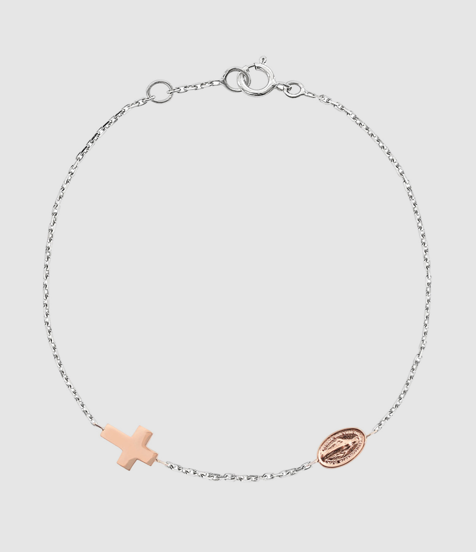 Bracelet sur chaîne en or gris, avec pendentifs croix et médaille "Madone" en or rose. Fermoir classique à ressort avec contre-anneau.