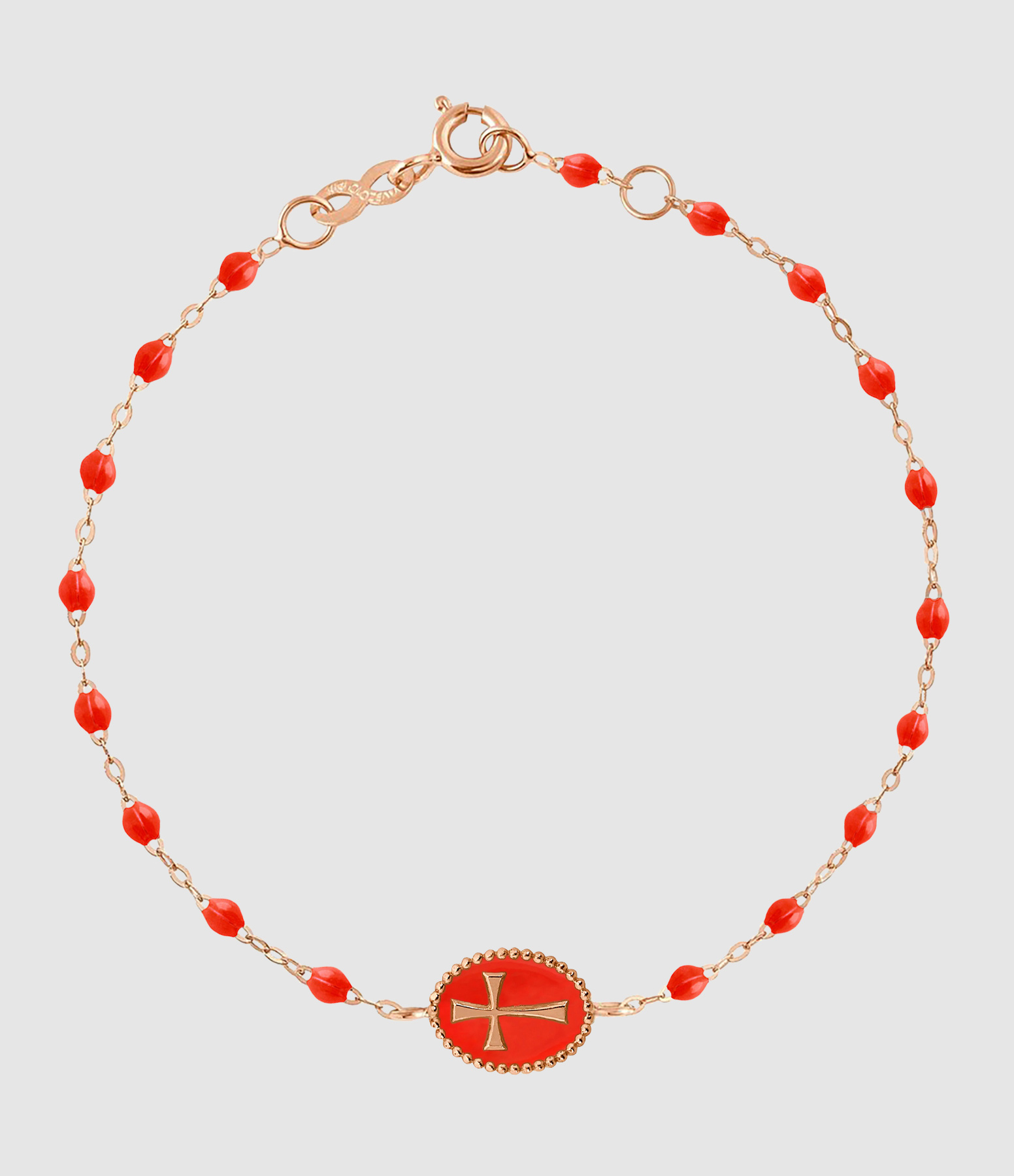 Bracelet sur chaîne en or gris, jaune ou rose agrémenté de perles de résine colorée et d'une médaille "Croix" émaillée du même coloris. Fermoir classique à ressort avec contre-anneaux.