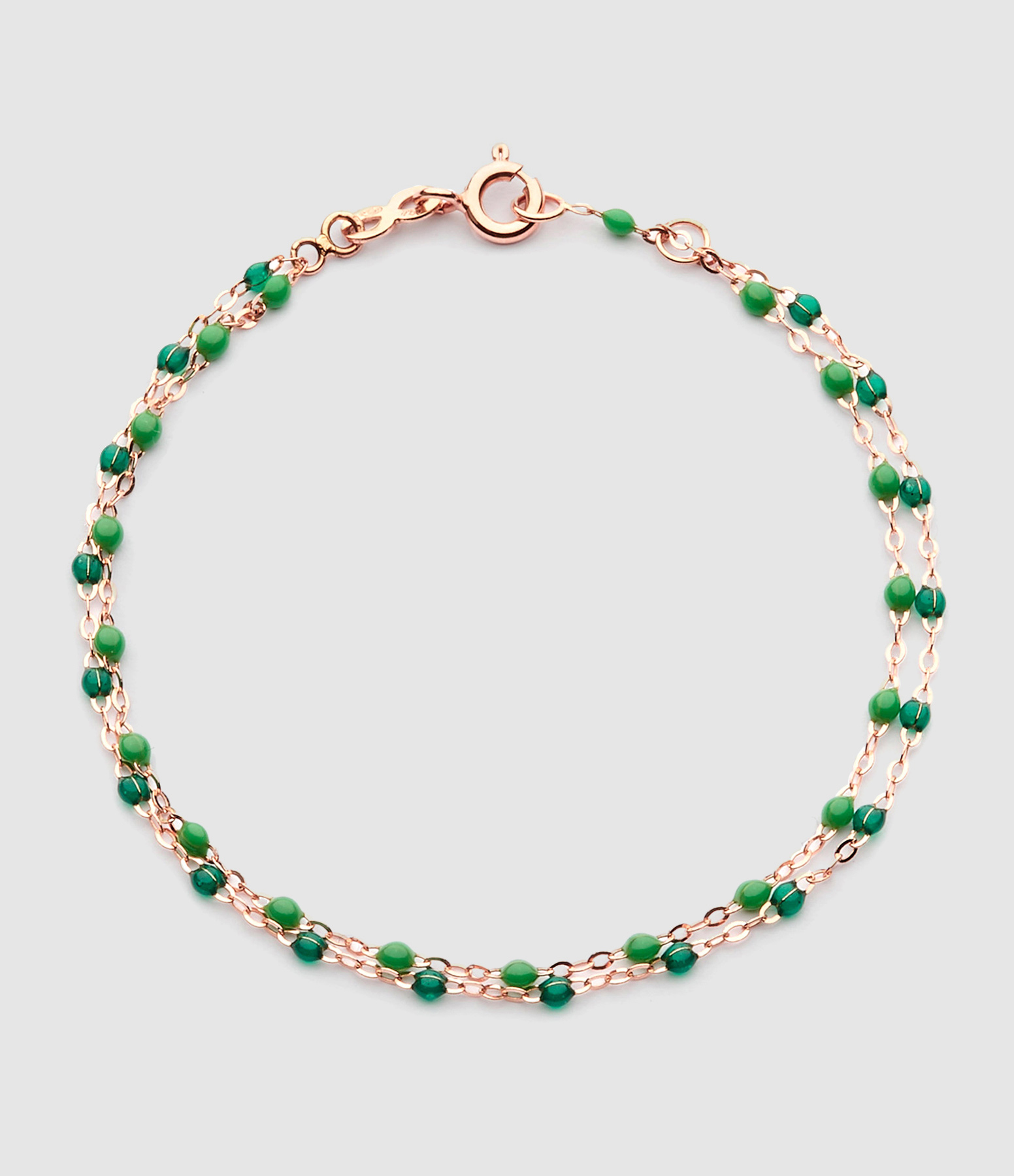 Bracelet double rang sur chaîne en or rose agrémenté de perles de résine. Fermoir classique à ressort avec contre anneau.