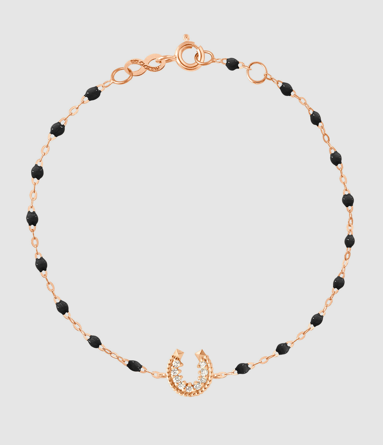Bracelet sur chaîne en or agrémenté de perles de résine et d'un pendentif fer à cheval en or 18 carats serti de 9 diamants. Fermoir classique à ressort avec contre-anneau.