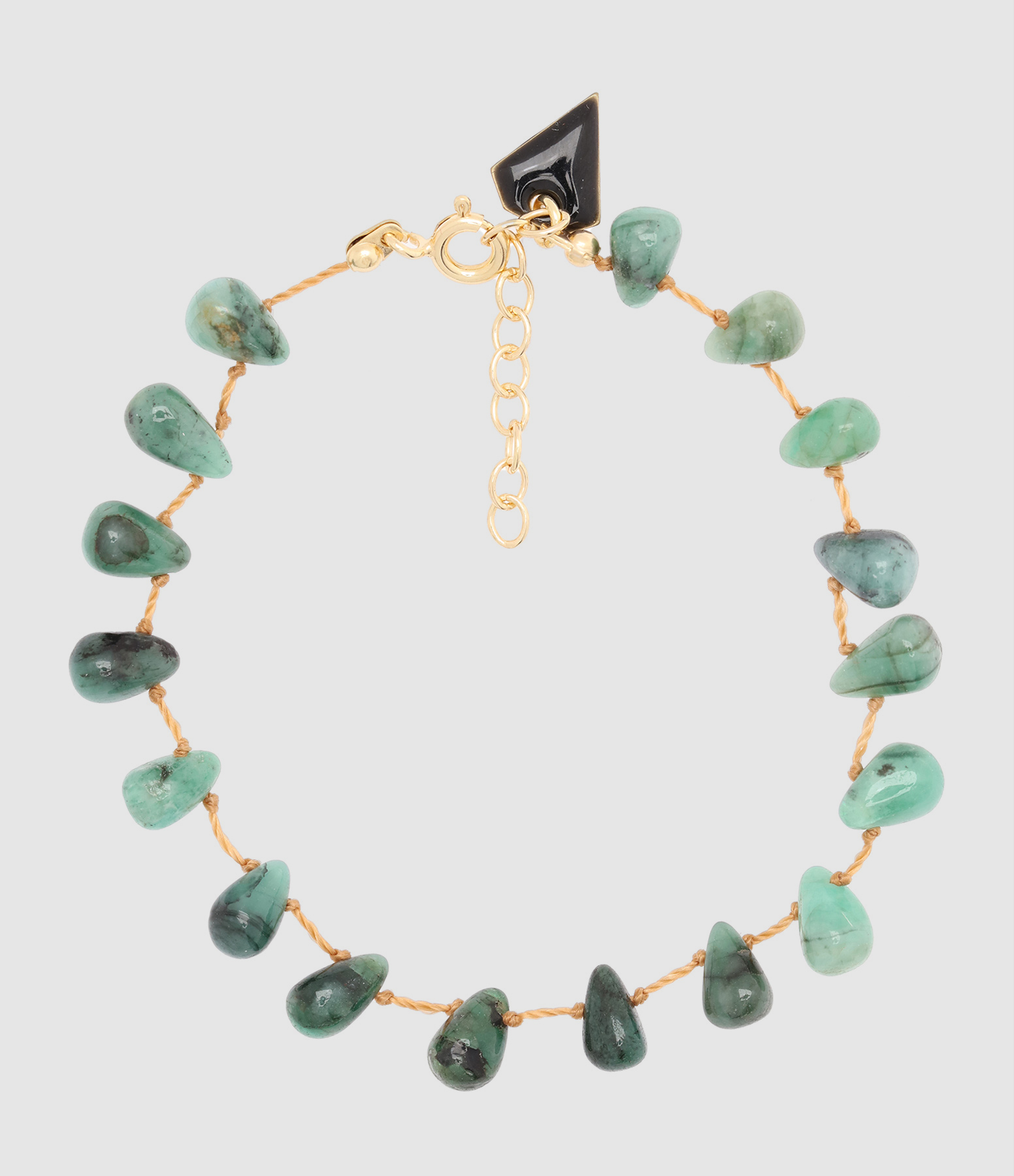 Bracelet en Émeraude sur cordon beige. Fermoir à ressort en argent plaqué or avec chaînette de réglage.