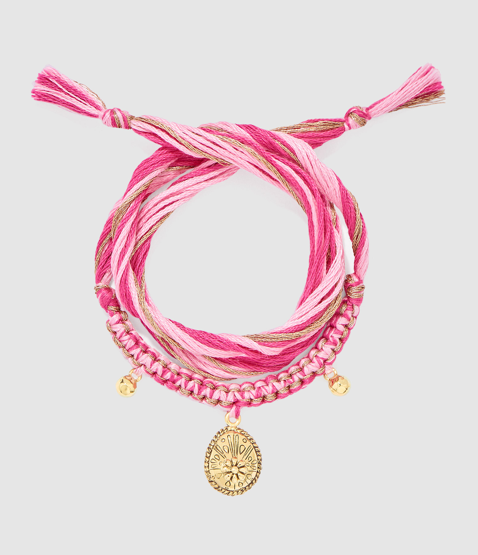 Bracelet en fils de coton rose, orné d'un pendentif avec une fleur et de deux perles dorés. À nouer.