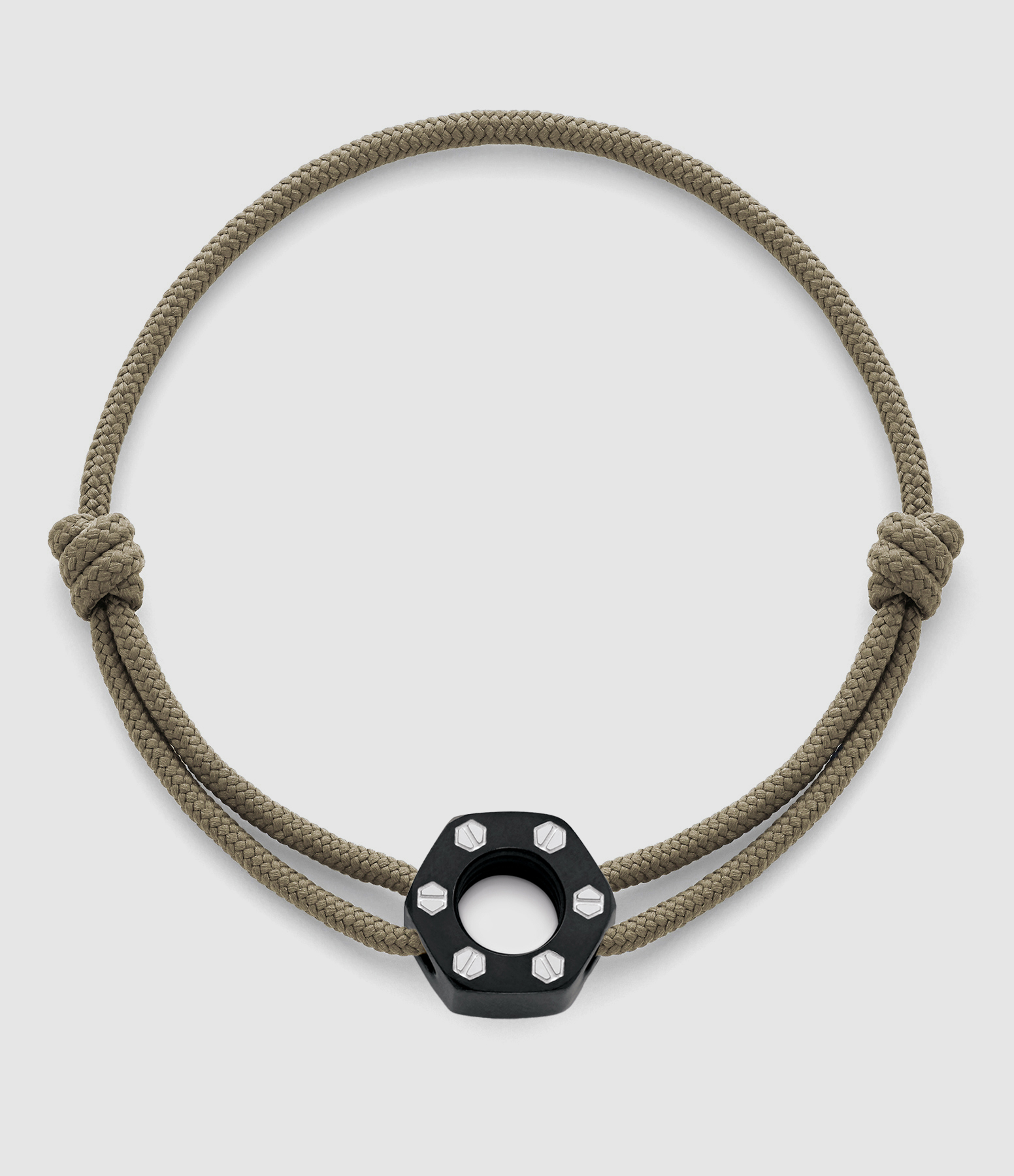 Bracelet sur cordon agrémenté d'un écrou en acier noir et détails argentés. Cordon ajustable par nœud coulissant.