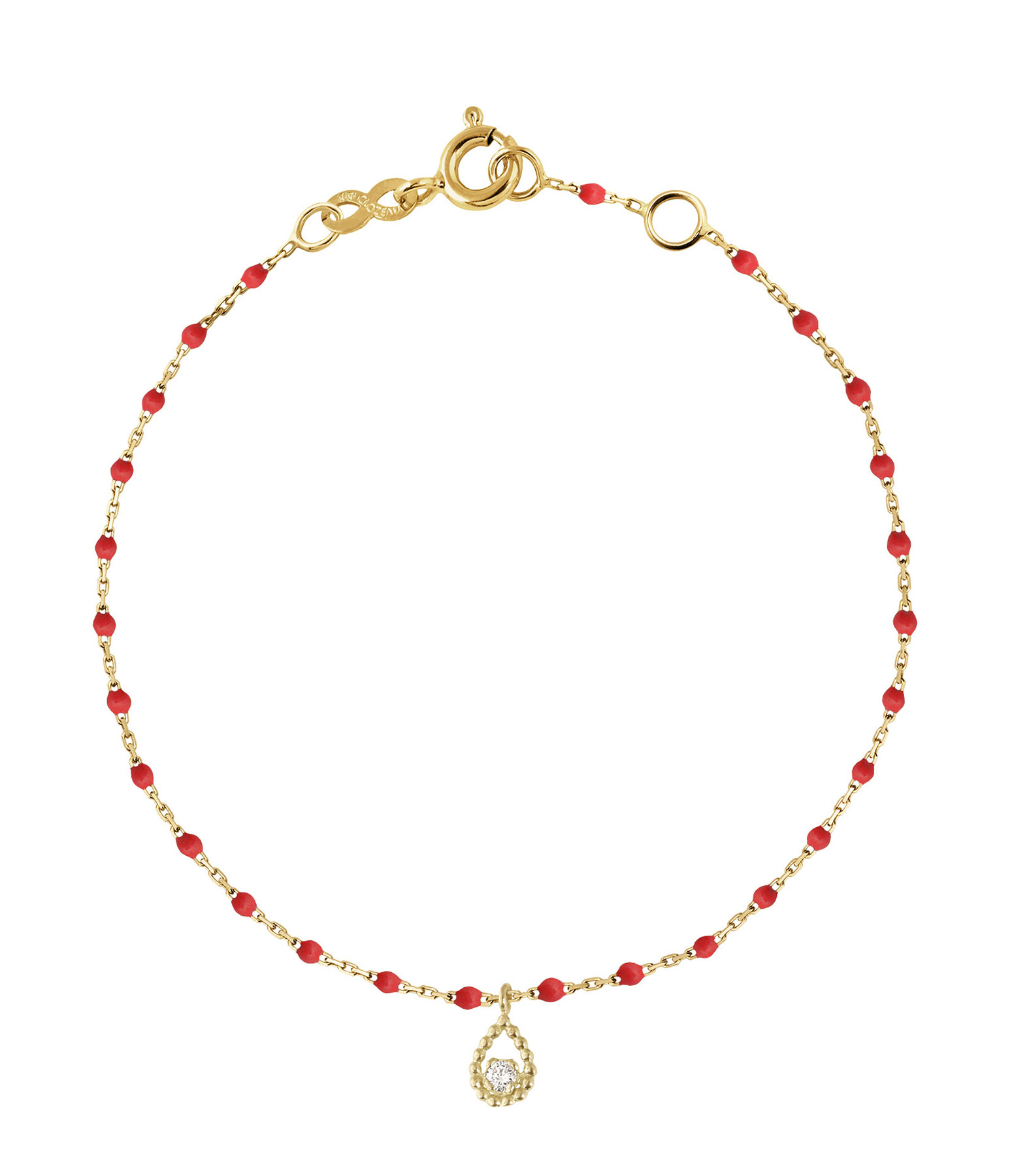 Bracelet sur chaîne en or rose, jaune ou gris agrémenté de mini perles de résine et d'un petit pendentif "poire" serti d'un diamant blanc. Fermoir classique à ressort avec contre-anneau.
