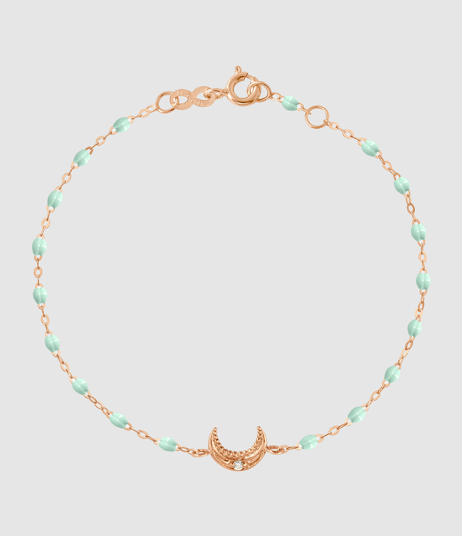Bracelet en or agrémenté de perles de résine. Fermoir classique à ressort avec contre-anneau. Pendentif lune serti d'un diamant.