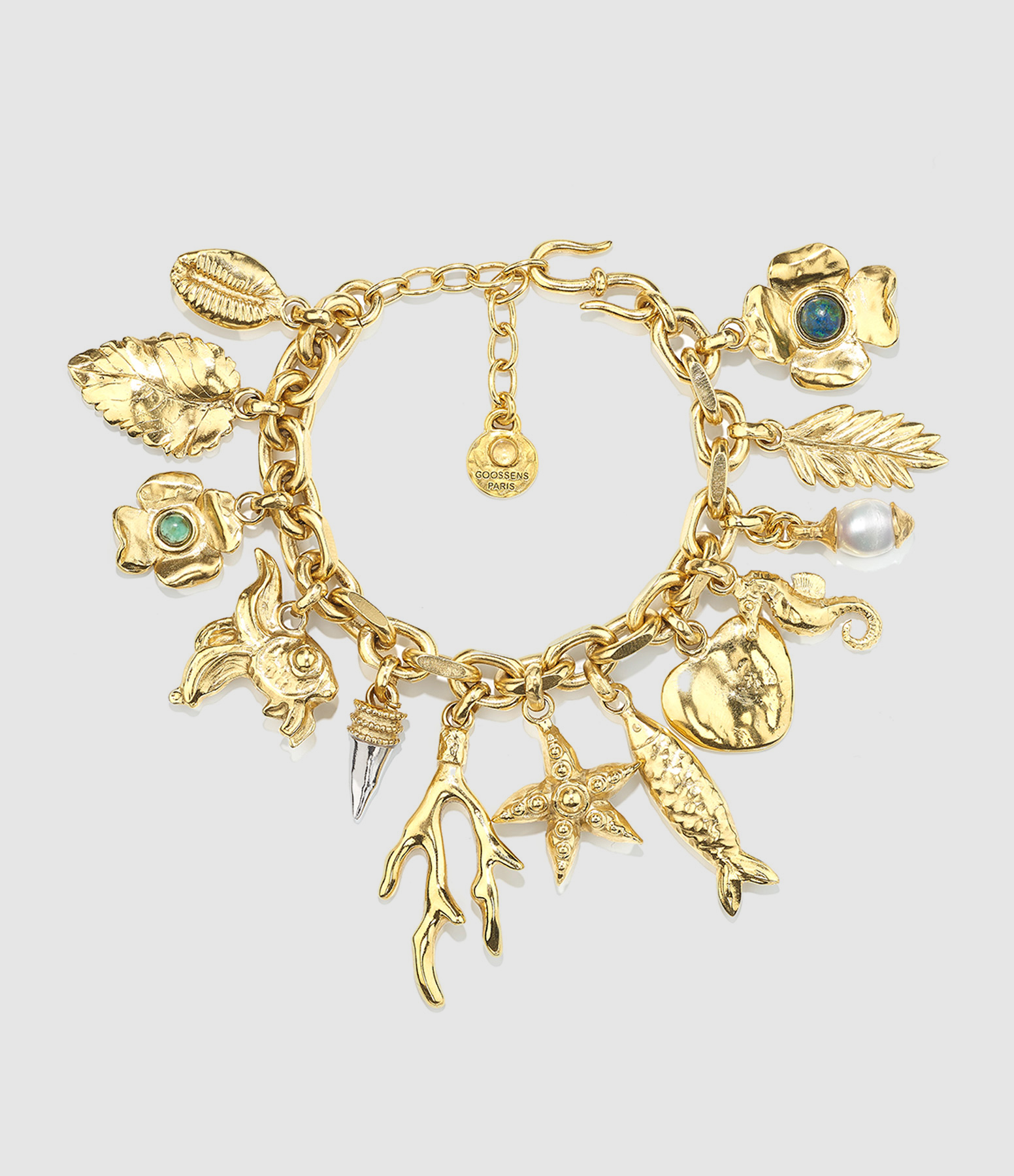 Bracelet doré en maillons entrecroisés, ornés de différents pendentifs emblématiques de la Maison Goossens.