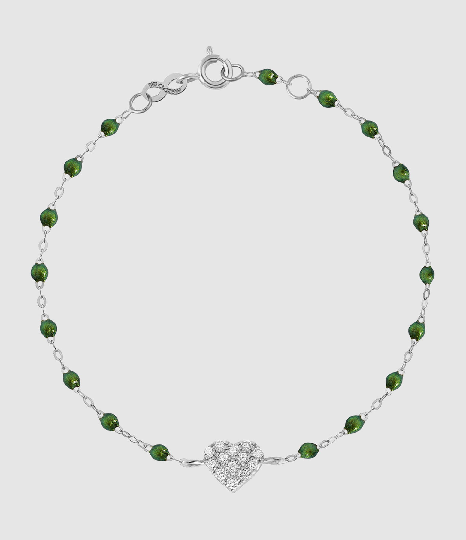 Bracelet sur chaîne en or agrémenté de perles de résine et d'un coeur serti de diamants. Fermoir classique à ressort avec contre-anneau.