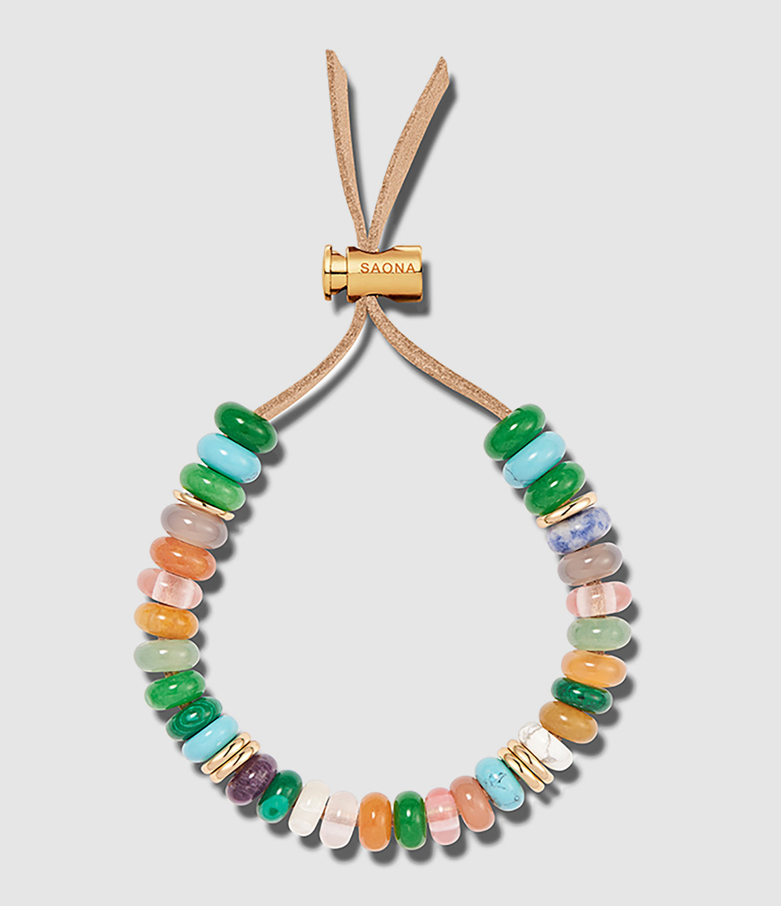 Bracelet en perles multicolores sur cordon en daim avec fermoir ajustable en plaqué or.