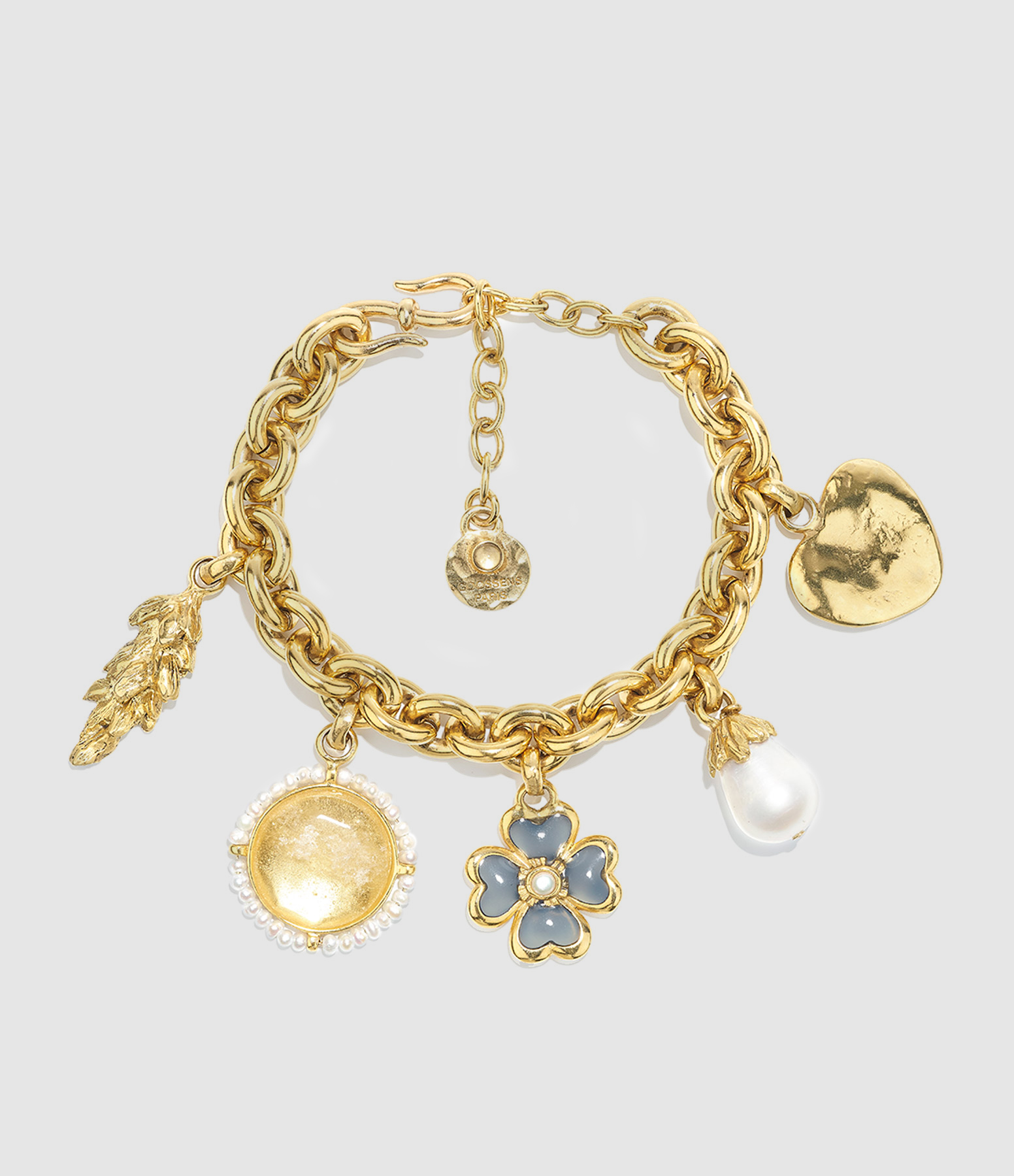 Bracelet doré en maillons entrecroisés, ornés de différents pendentifs emblématiques de la Maison Goossens ; trèfle, blé, médaille, perle et cœur. Fermoir en S avec contre-anneau.
