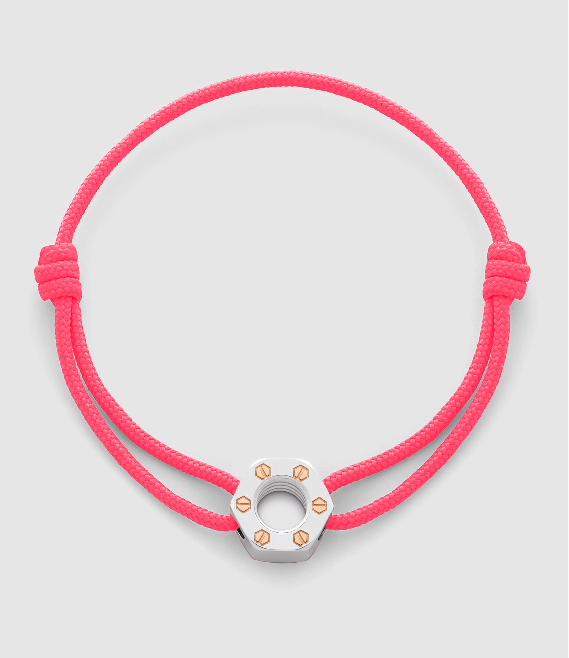 Bracelet sur cordon agrémenté d'un écrou en acier argenté et détails rose. Cordon ajustable par nœud coulissant.