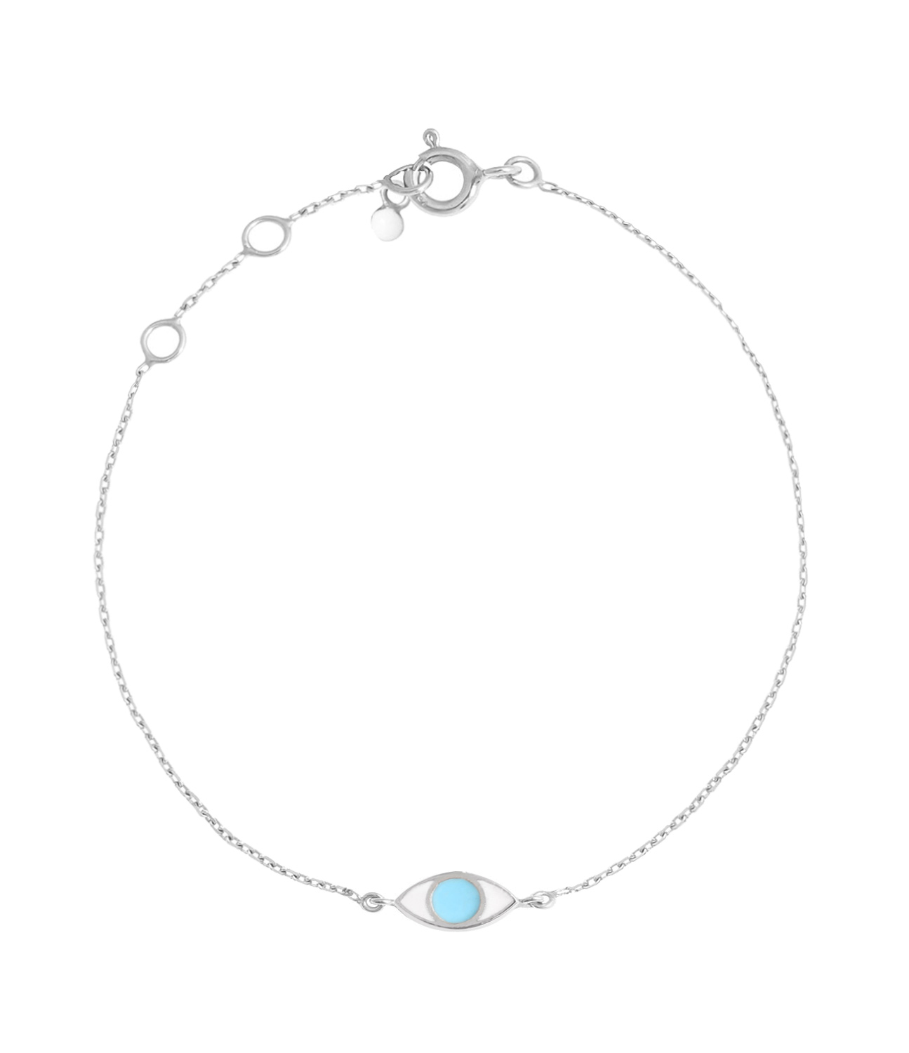 Bracelet sur chaîne en or rose, jaune ou gris agrémenté d'un pendentif "œil" serti de résine blanche et turquoise. Fermoir classique à ressort avec contre-anneau.