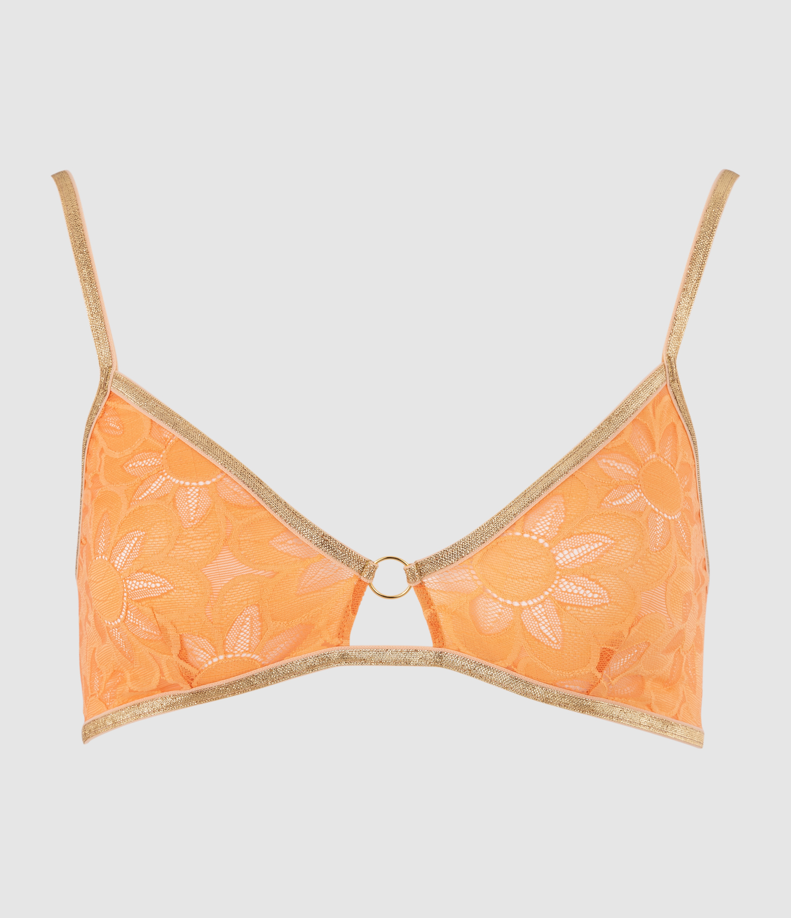 Brassière sans armatures en dentelle orange. Forme triangle décolleté en plongeant et bijoux rond entre les seins. Bretelles lurex dorées pailletées.