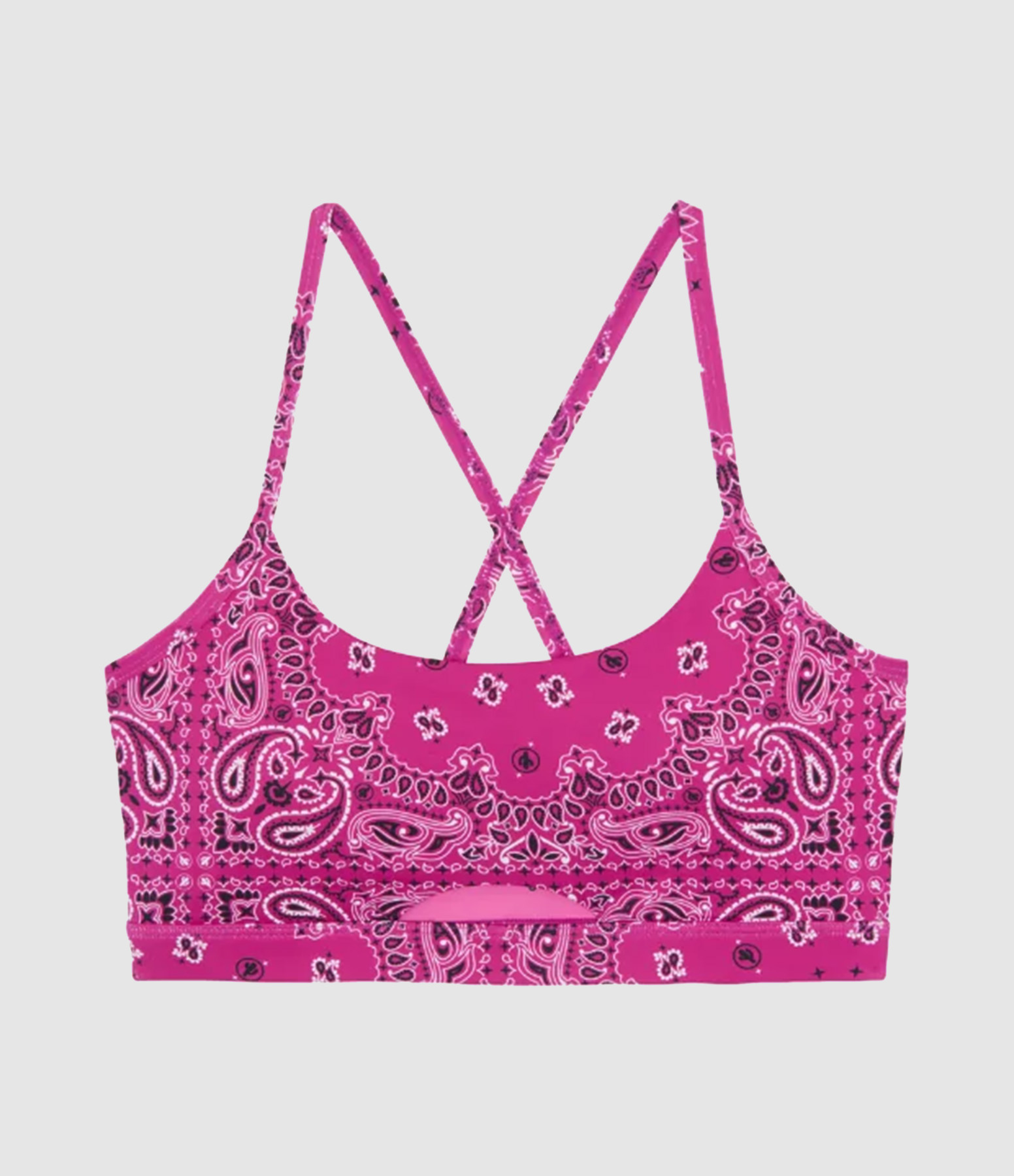 Brassière de sport à motif bandana rose, conçu pour le yoga.