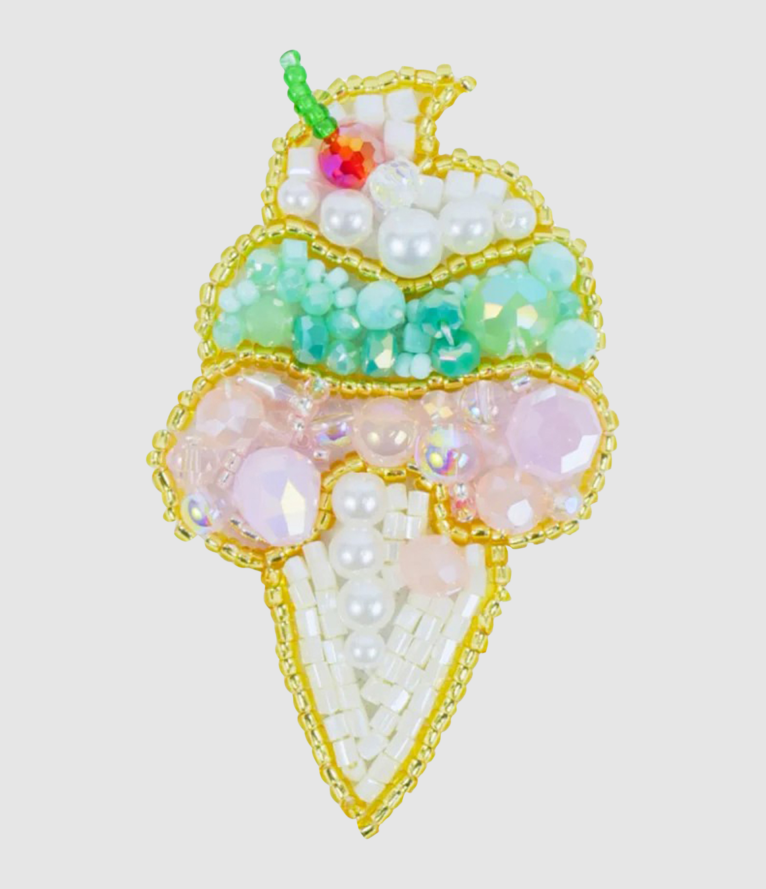 Une broche en forme de glace, délicatement brodée et perlée, pour une touche fun et couture à la fois.