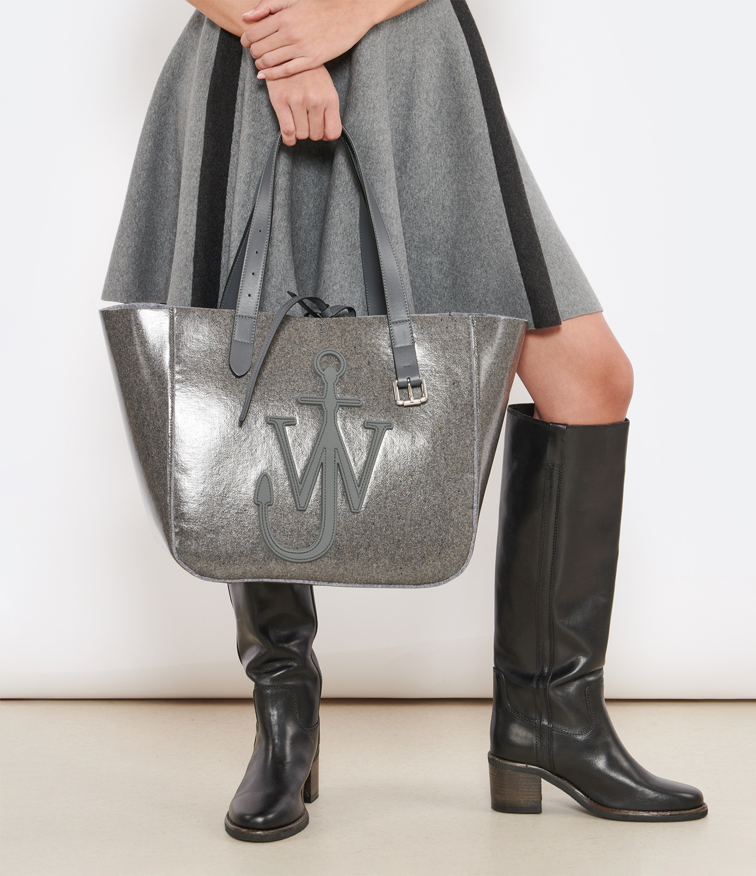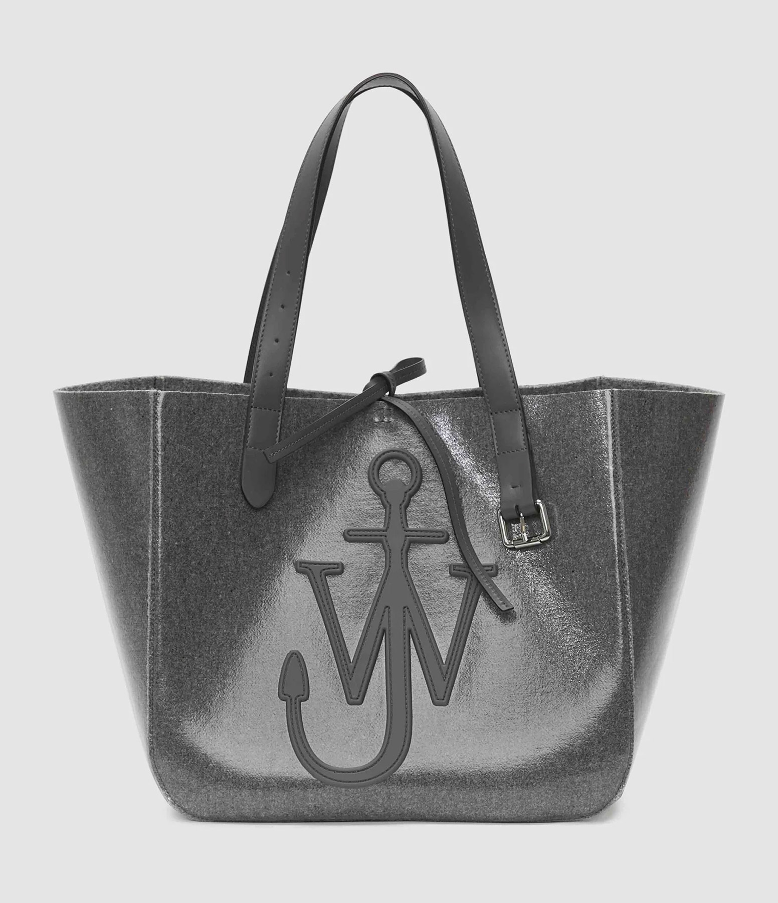 Sac cabas gris en feutre enduit et finitions en cuir de veau lisse. Logo JW ancre en caoutchouc sur le devant. Anses en cuir avec surpiqûres ton sur ton. Fermeture par lien en cuir. Boucle de ceinture argentée. Poche intérieure plaquée en cuir avec logo embossé.