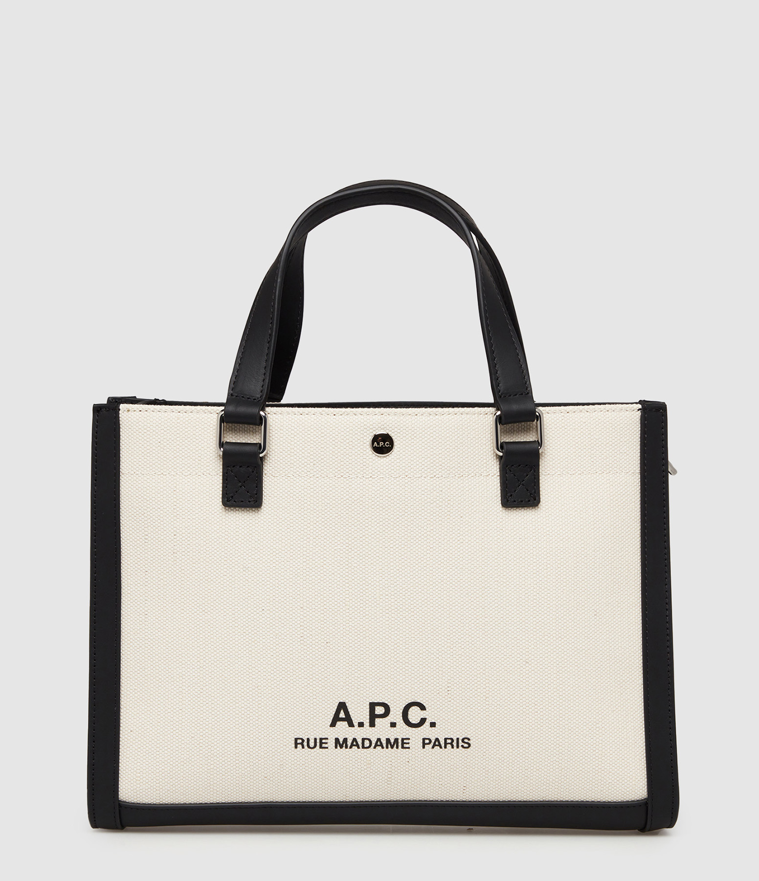 Cabas en toile beige entouré de cuir noir. Une poche intérieur. Fermeture par bouton pression. Bandoulière ajustable. Logo sérigraphié "A.P.C Rue Madame Paris".