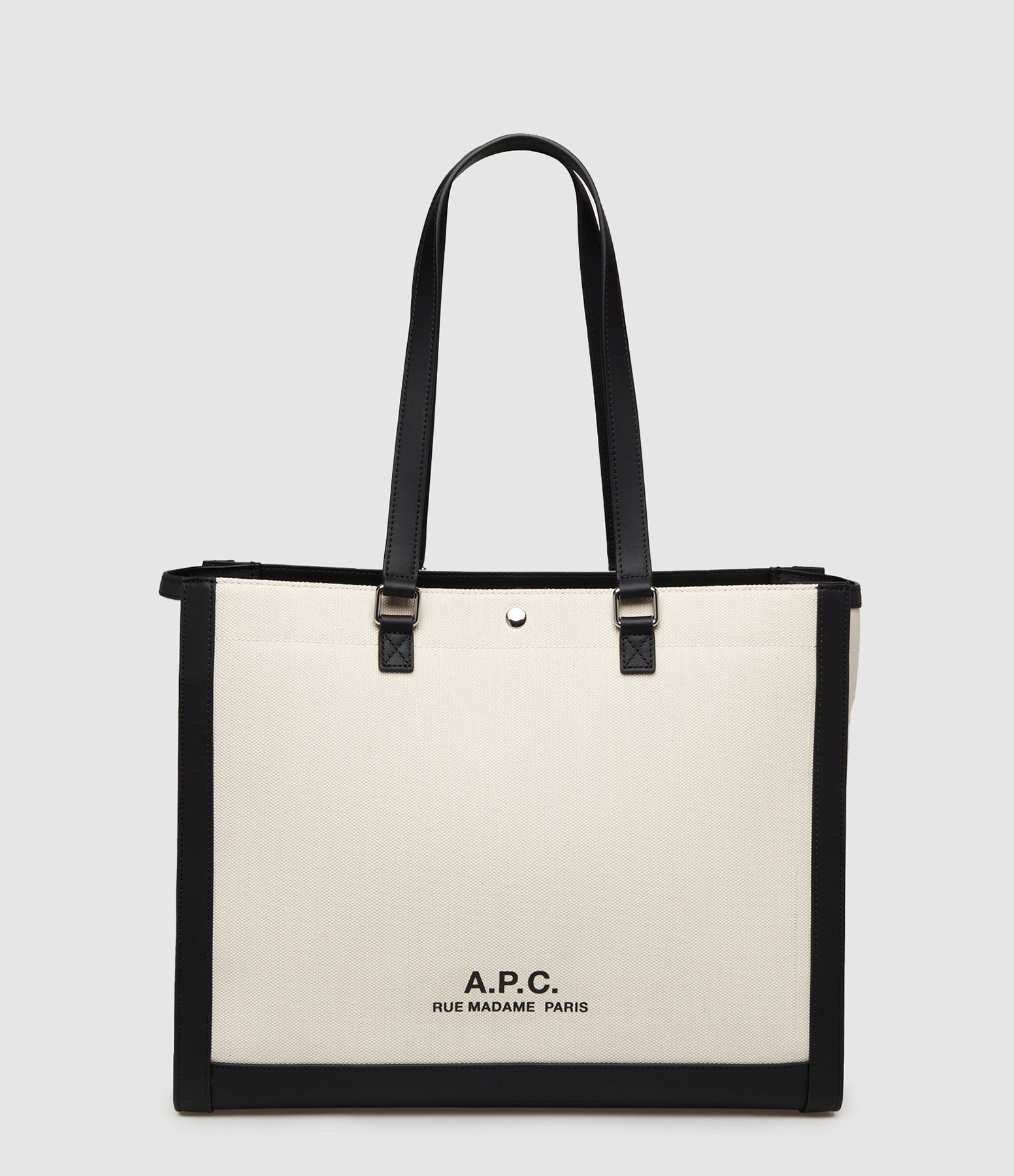 Cabas en toile beige entouré de cuir noir. Une poche à l'intérieur. Fermeture par bouton pression. Poignées pour un porté main. Bandoulière pour un porté épaule ou bandoulière. Logo sérigraphié "A.P.C Rue Madame Paris".