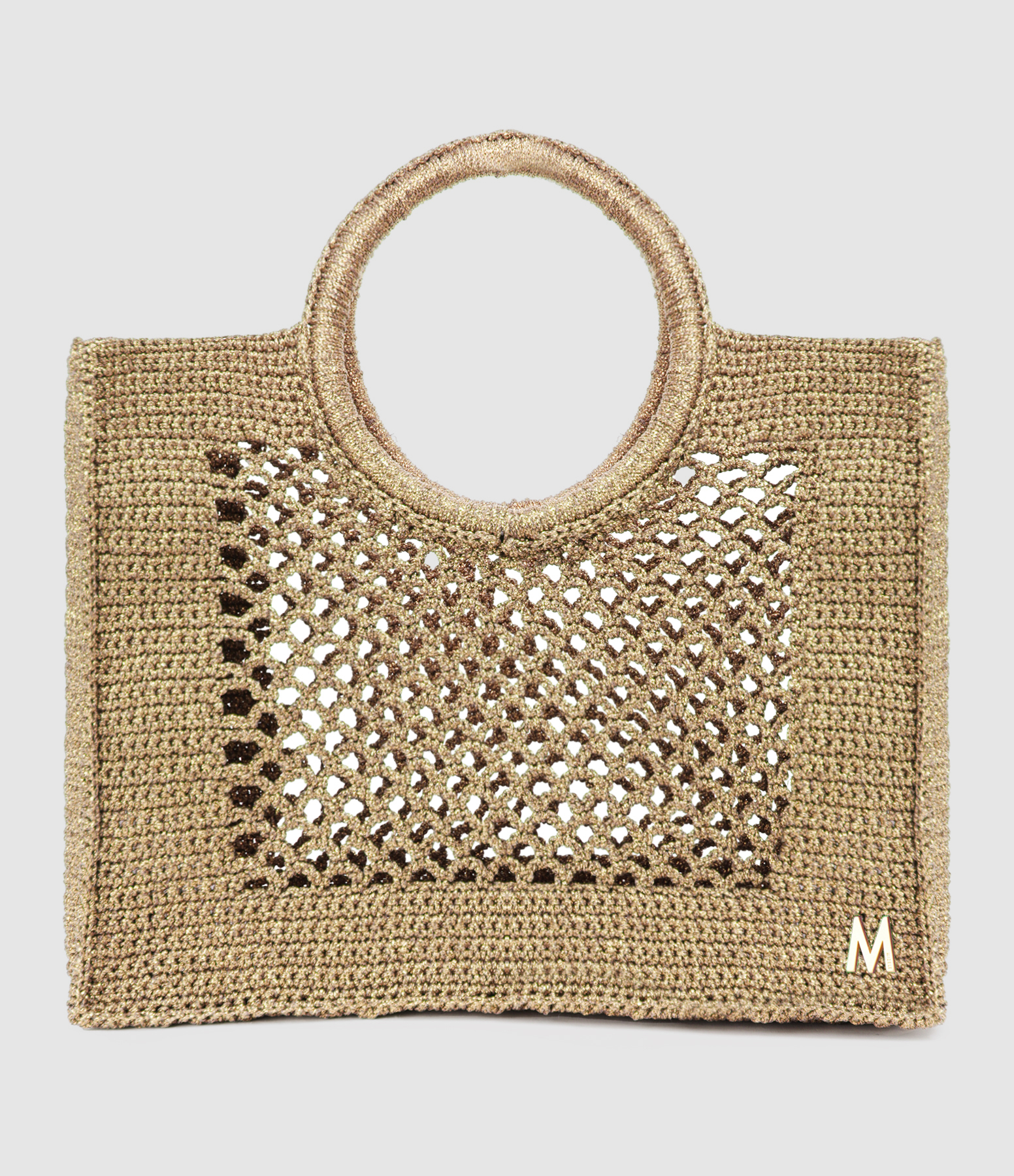 Cabas en lurex doré pailleté ajouré.