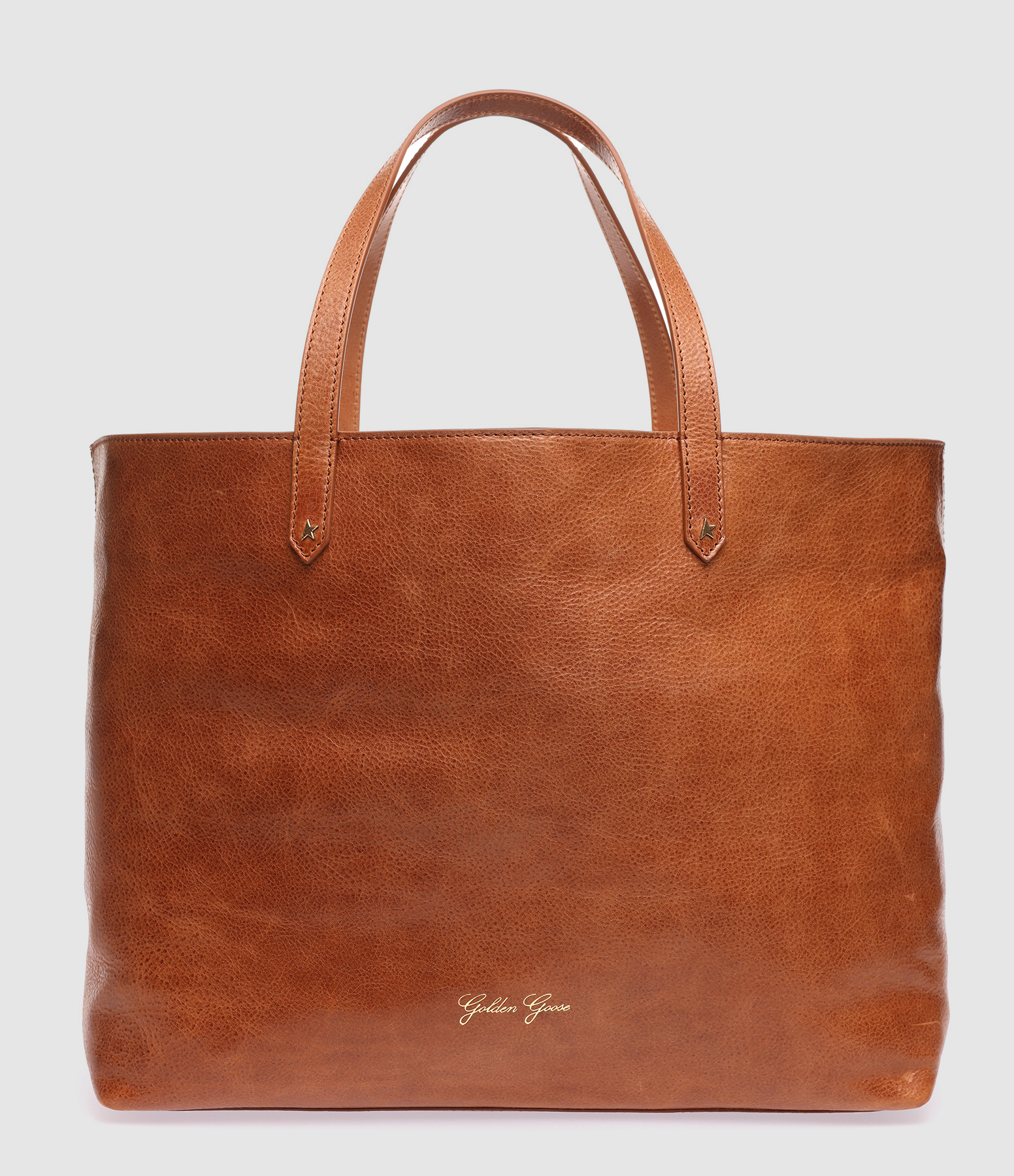 Sac cabas en cuir grainé camel. Deux anses en cuir lisse avec cabochons dorés en forme du logo étoile. Inscription "Golden Goose" embossée en dorée sur le devant. Fermeture par bouton aimanté. Intérieur doublé en coton composé d'un grand compartiment avec une poche zippée.