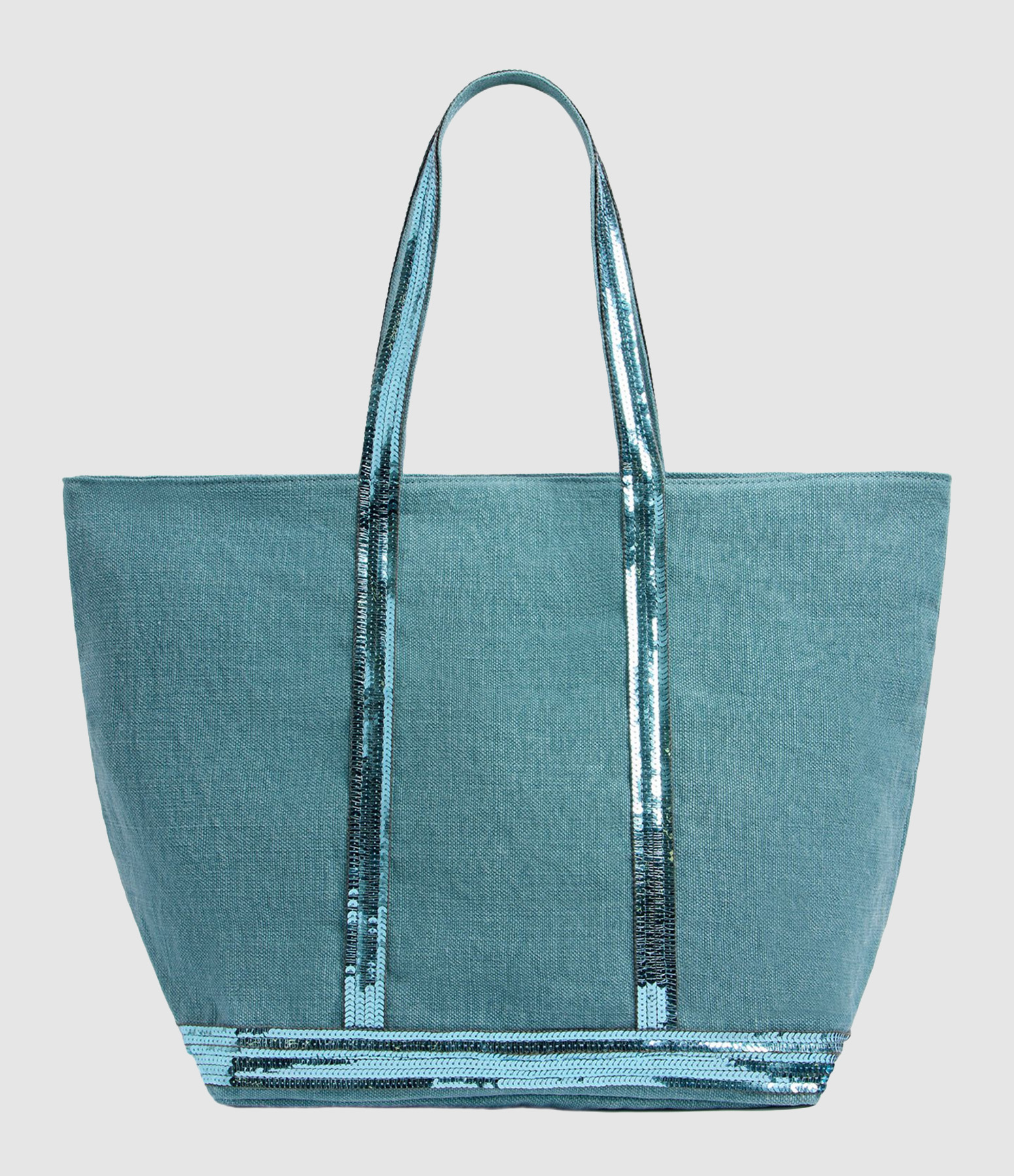 Cabas en lin de coton bleu iris, surmonté de sequins. Une poche intérieure zippée. Fermeture par zip. Non doublé.