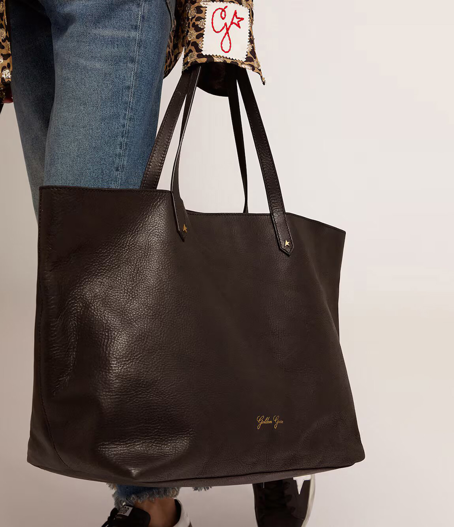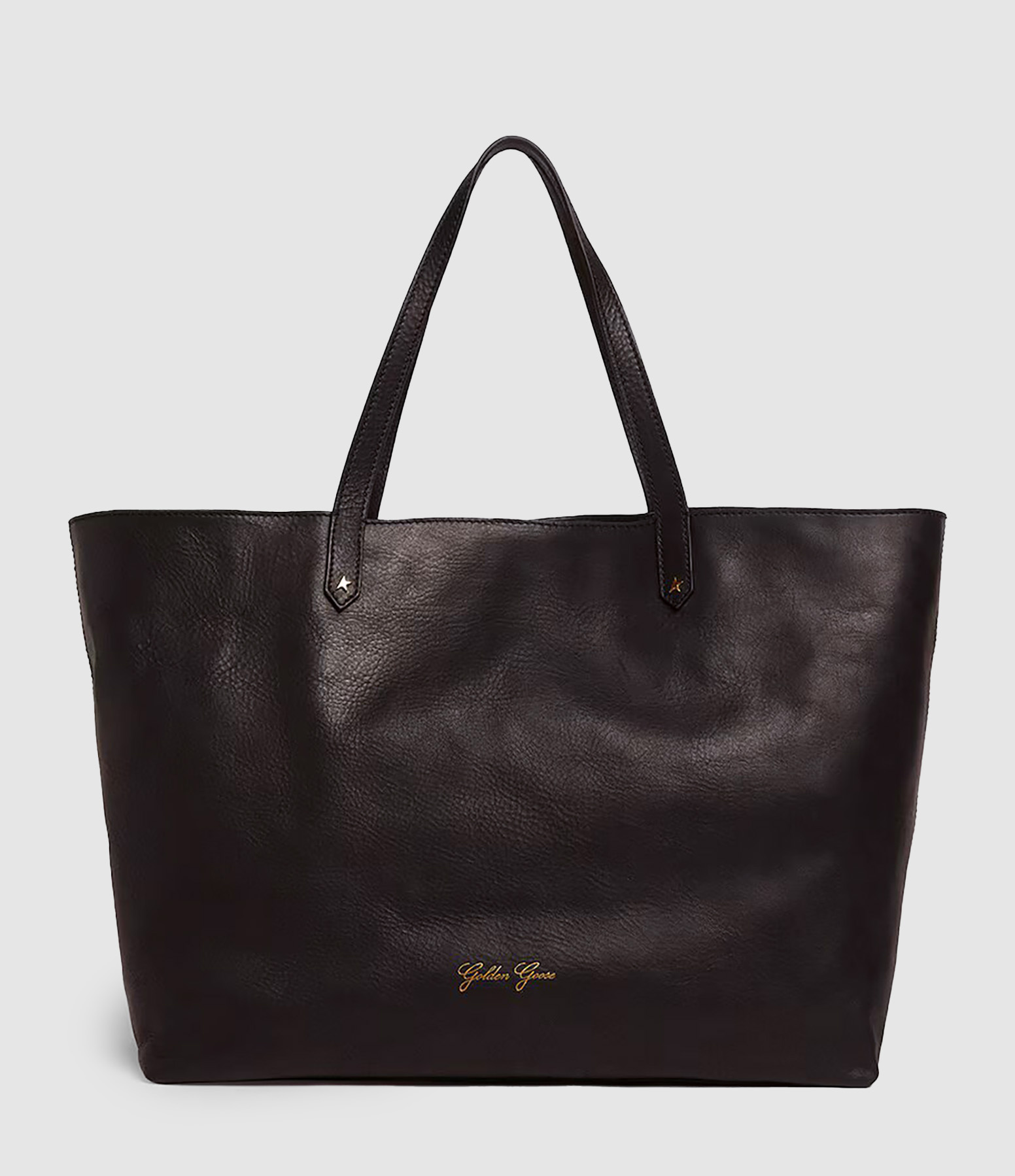 Cabas en cuir lisse noir. Deux anses en cuir avec petites étoiles en métal doré. Inscription dorée "Golden Goose". Fermeture aimantée. Une poche plaquée et zippée en tissu à l'intérieur.