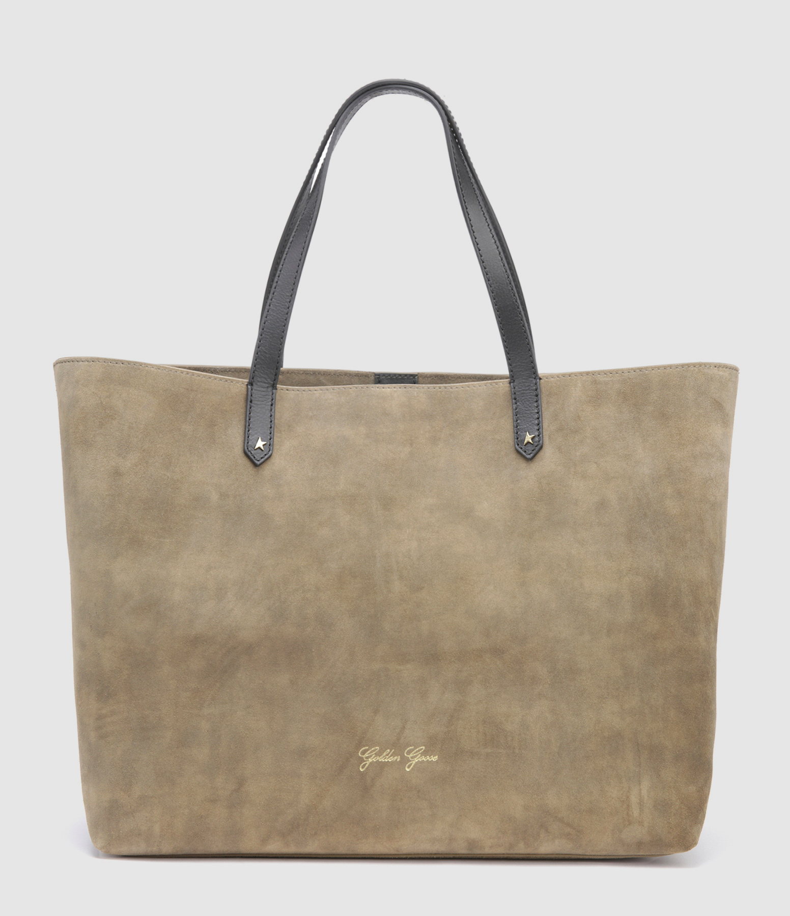 Sac cabas en cuir suédé kaki. Deux anses en cuir lisse noir avec cabochons dorés en forme du logo "étoile". Inscription "Golden Goose" embossée en dorée sur le devant. Fermeture par bouton aimanté. Intérieur composé d'un grand compartiment avec une poche zippée.