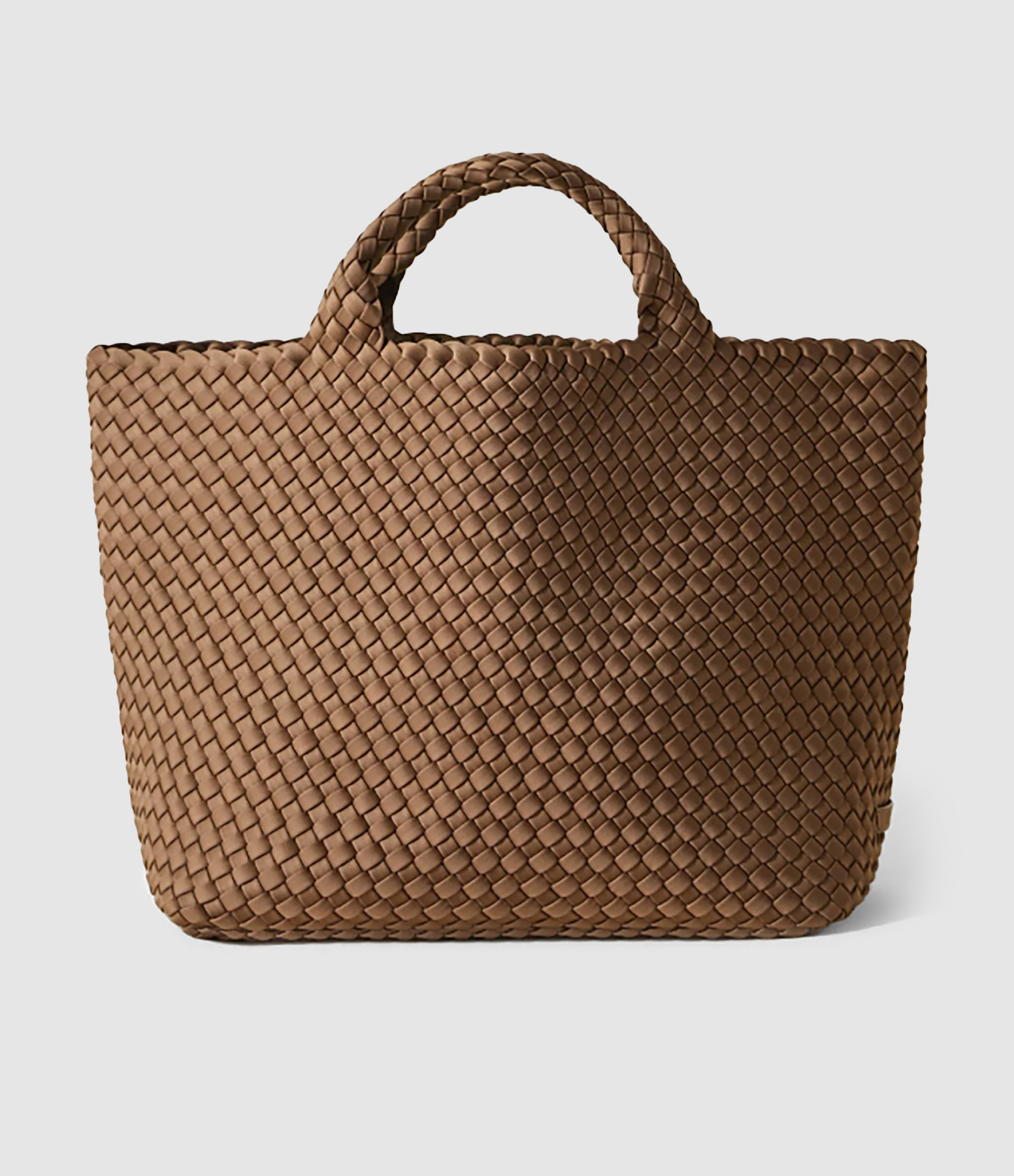 Sac marron tressé à la main. Deux anses. Compartiment unique avec pochette zippée intégrée.