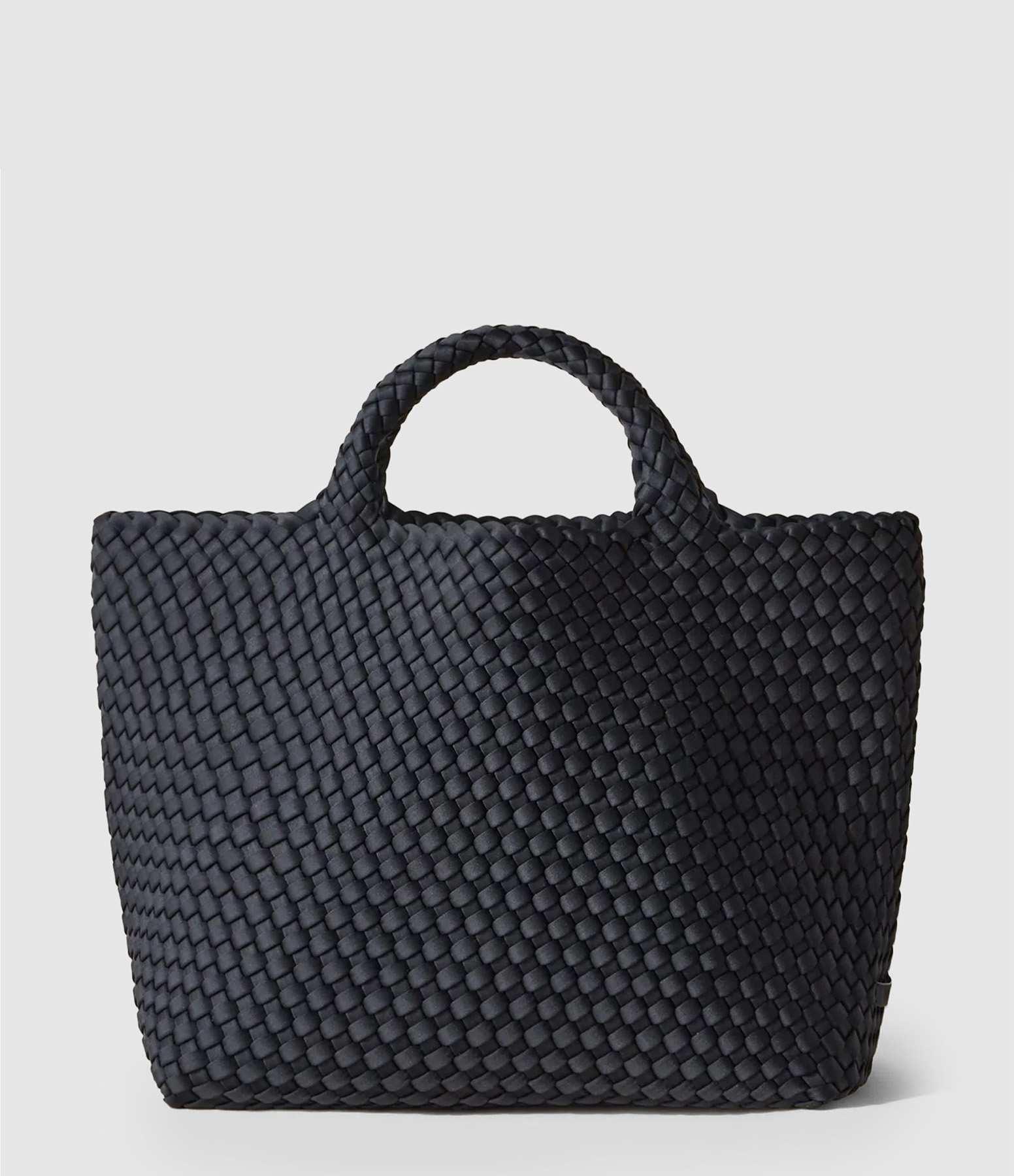 Sac noir tressé à la main. Deux anses. Compartiment unique avec pochette zippée intégrée.