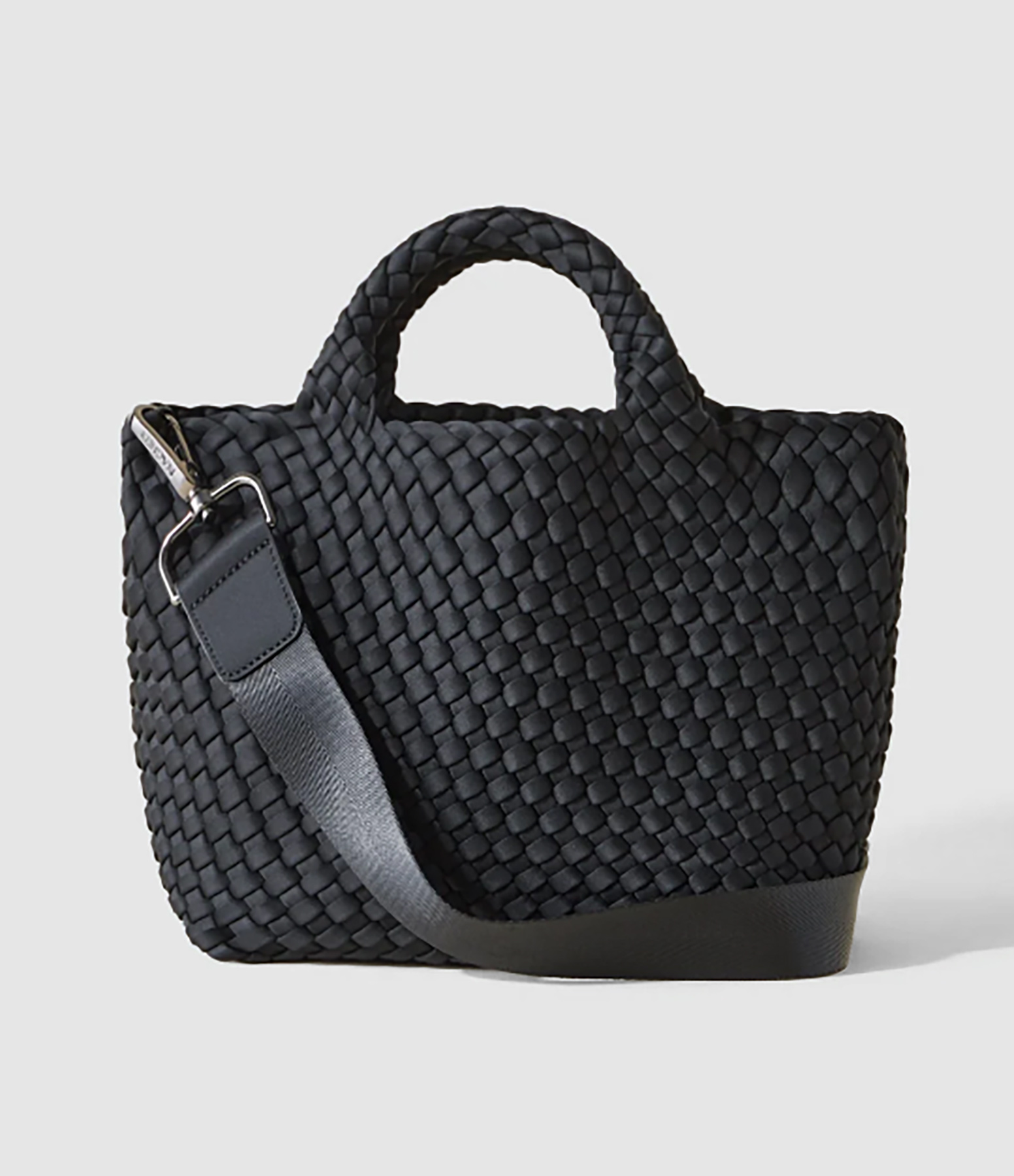 Sac noir tressé à la main. Deux anses et bandoulière amovible. Compartiment unique avec pochette zippée intégrée.