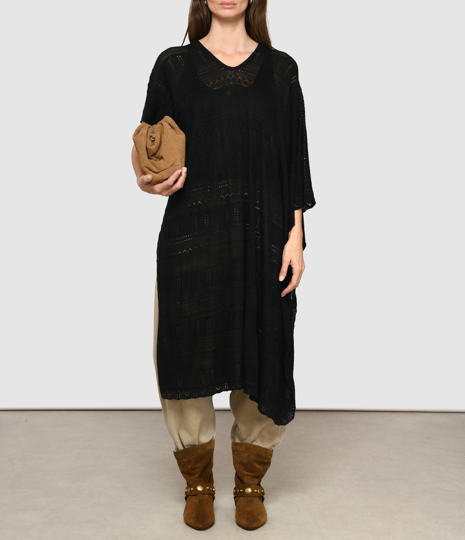 Cape mi-longue en maille pointelle noire. Encolure en V.