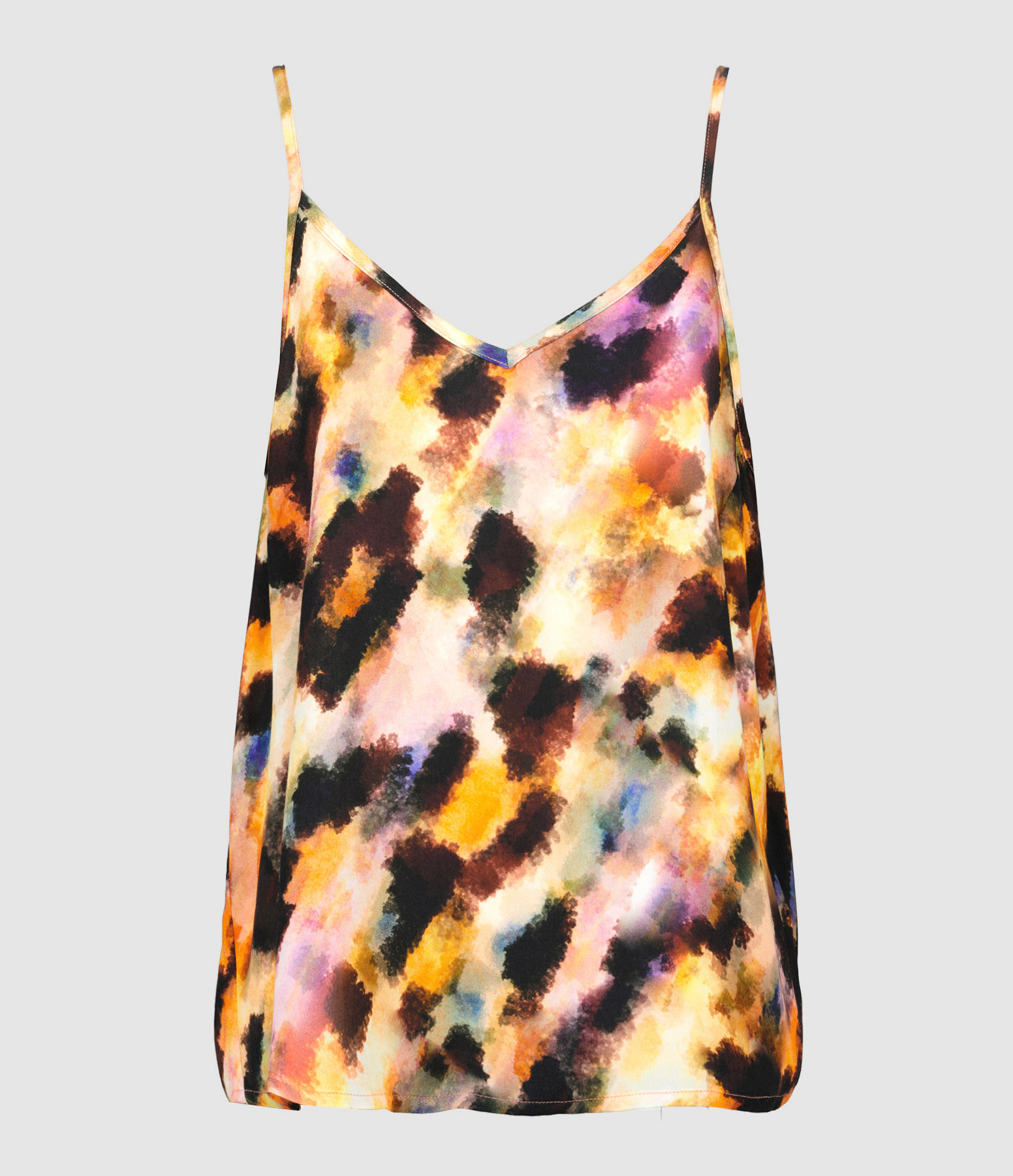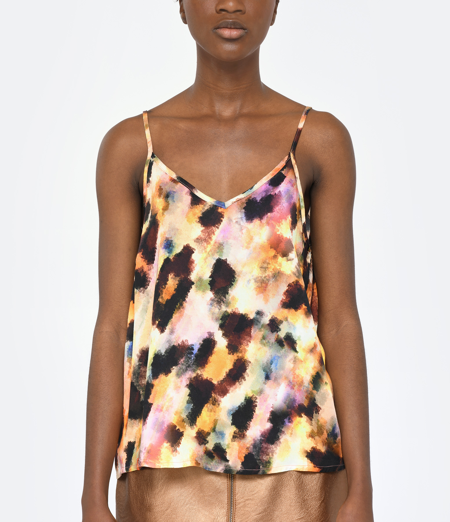 Débardeur à imprimé multicolore. Bretelles fines. Décolleté en V. Coupe droite. Base droite.