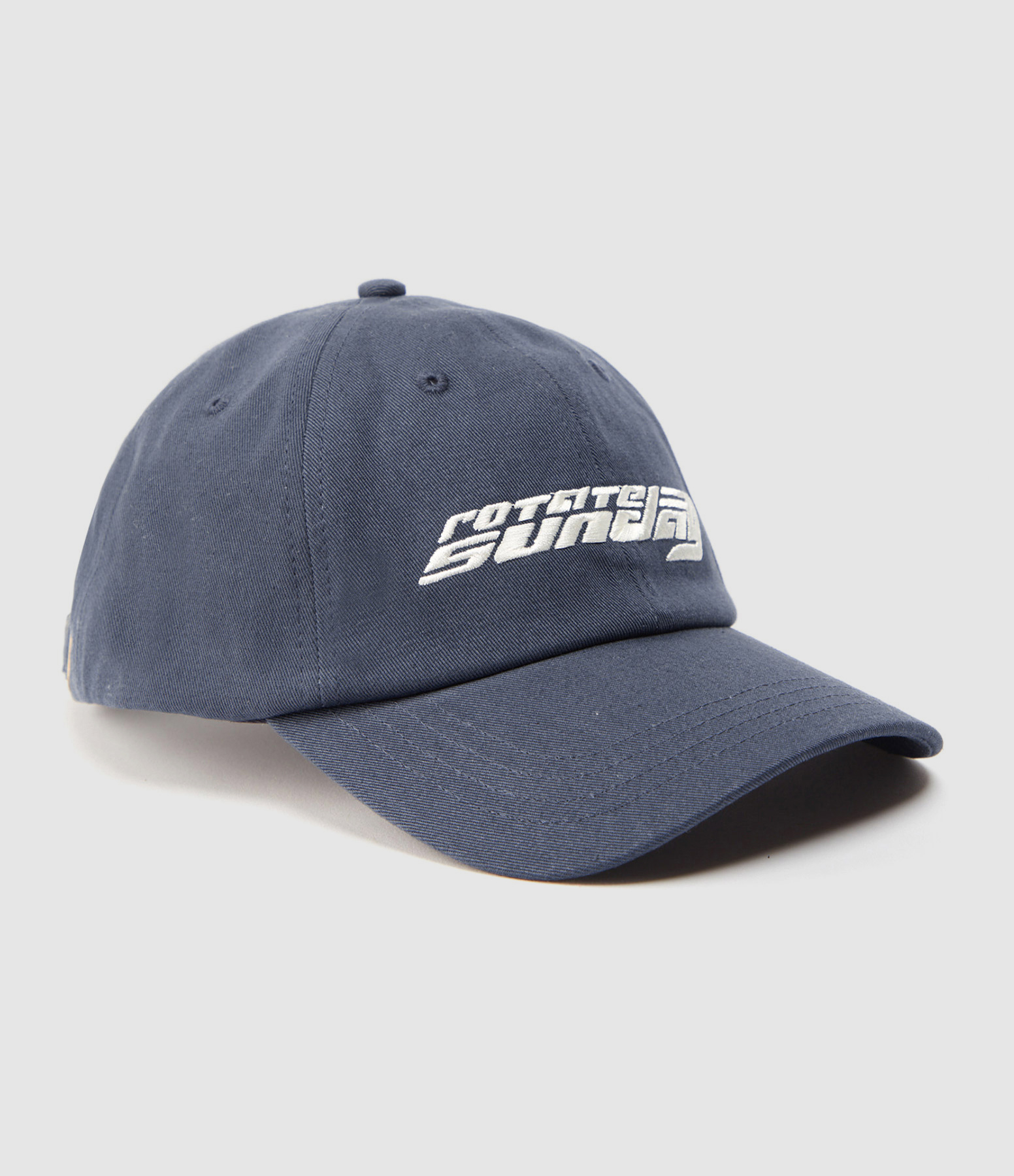 Casquette en coton bleu. Inscription blanche "ROTATE SUNDAY" brodée à l'avant. Languette réglable à l'arrière. Bande de propreté sur l'intérieur.