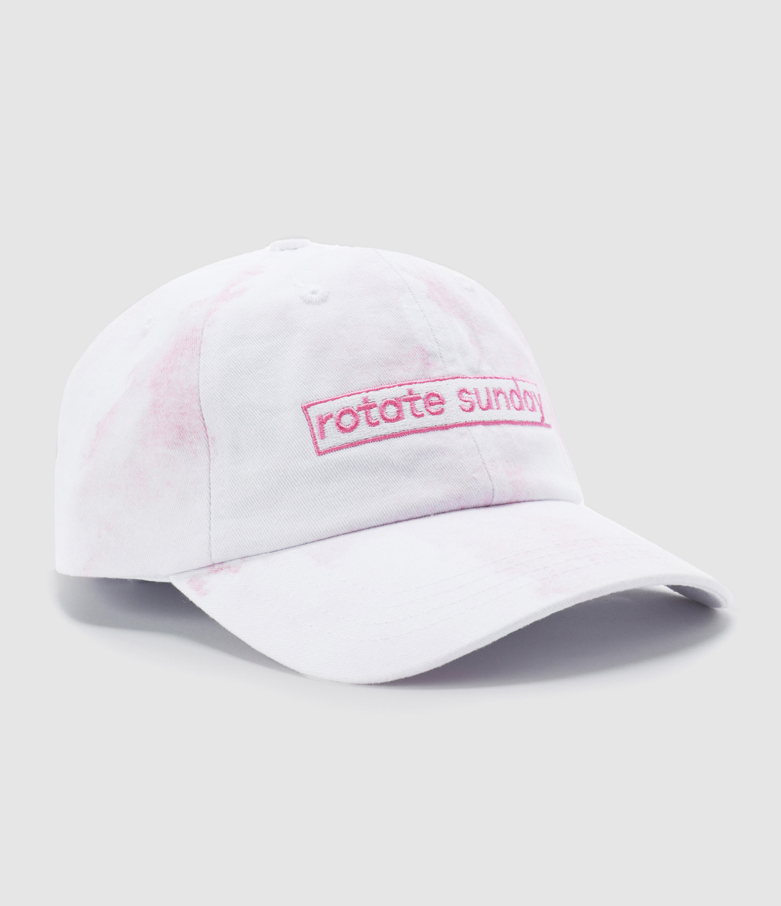 Casquette en coton effet tye and die blanc et rose. Écusson blanc avec inscription rose"ROTATE SUNDAY" brodée à l'avant. Languette réglable à l'arrière. Bande de propreté sur l'intérieur.