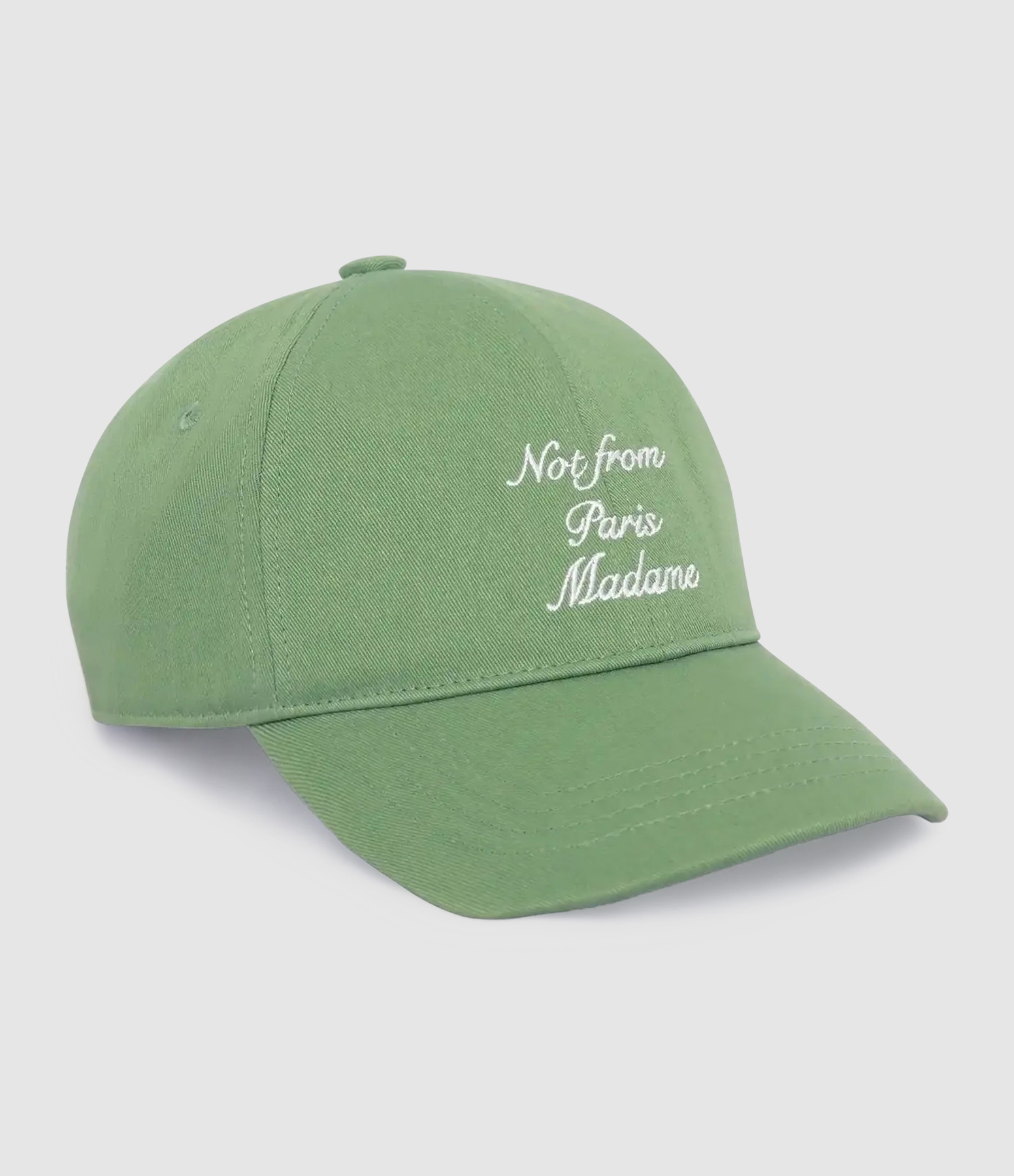 Casquette verte avec slogan brodé "NOT FROM PARIS MADAME" et réglable à l’arrière.