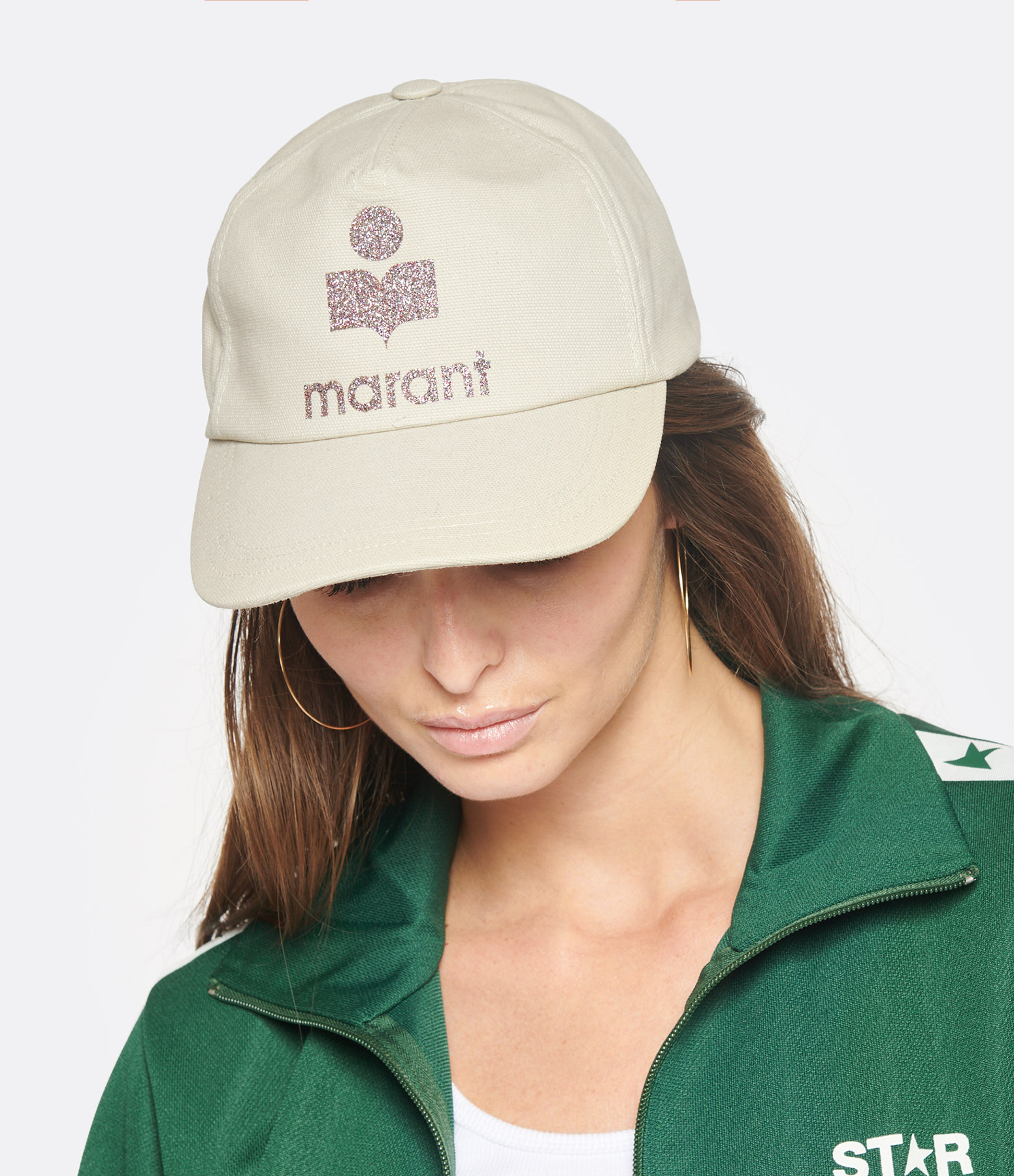 Casquette en coton écru. Logo en flockage paillette multicolore sur la calotte. Fermeture par scratch à l'arrière. Bande de propreté sur l'intérieur. Doublée en coton.