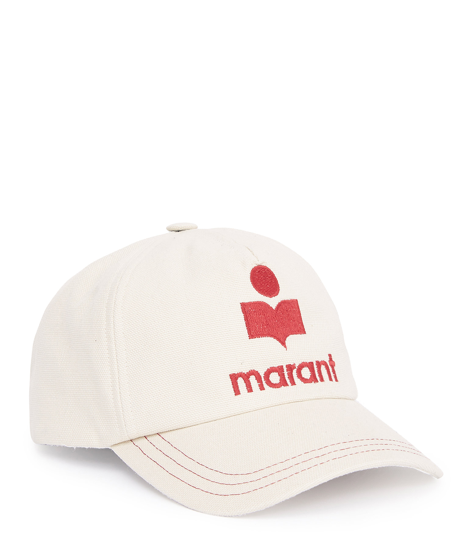Casquette en coton écru avec logo rouge brodé à l'avant. Fermeture par scratch à l'arrière. Bande de propreté sur l'intérieur.