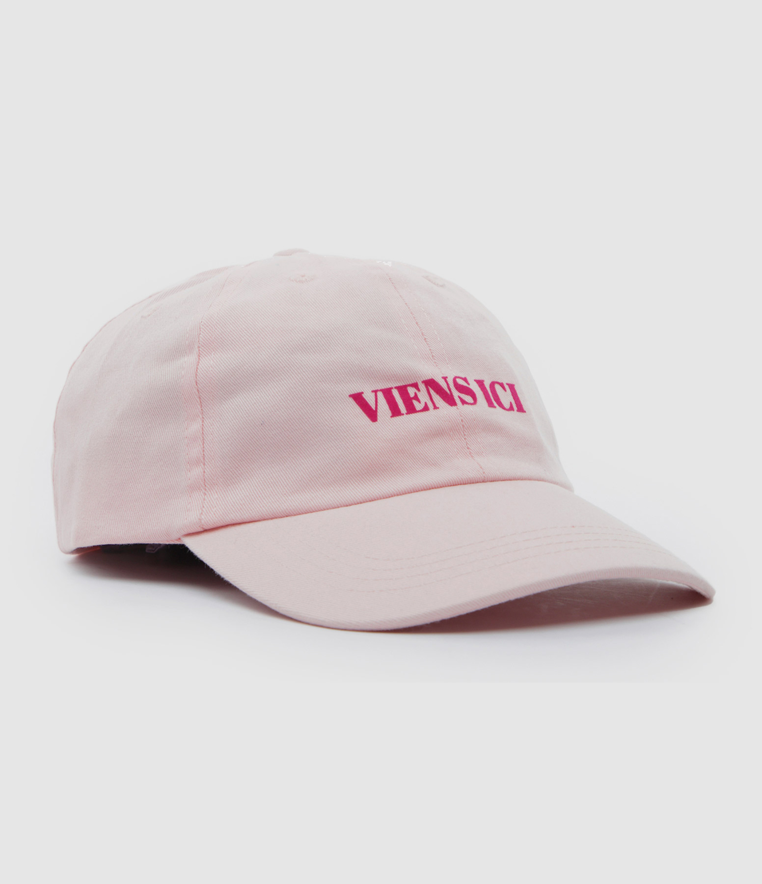 Casquette en coton rose. Inscription "VIENS ICI" rose à l'avant et "DEAR JULIETTE" côté gauche. Languette réglable à l'arrière.