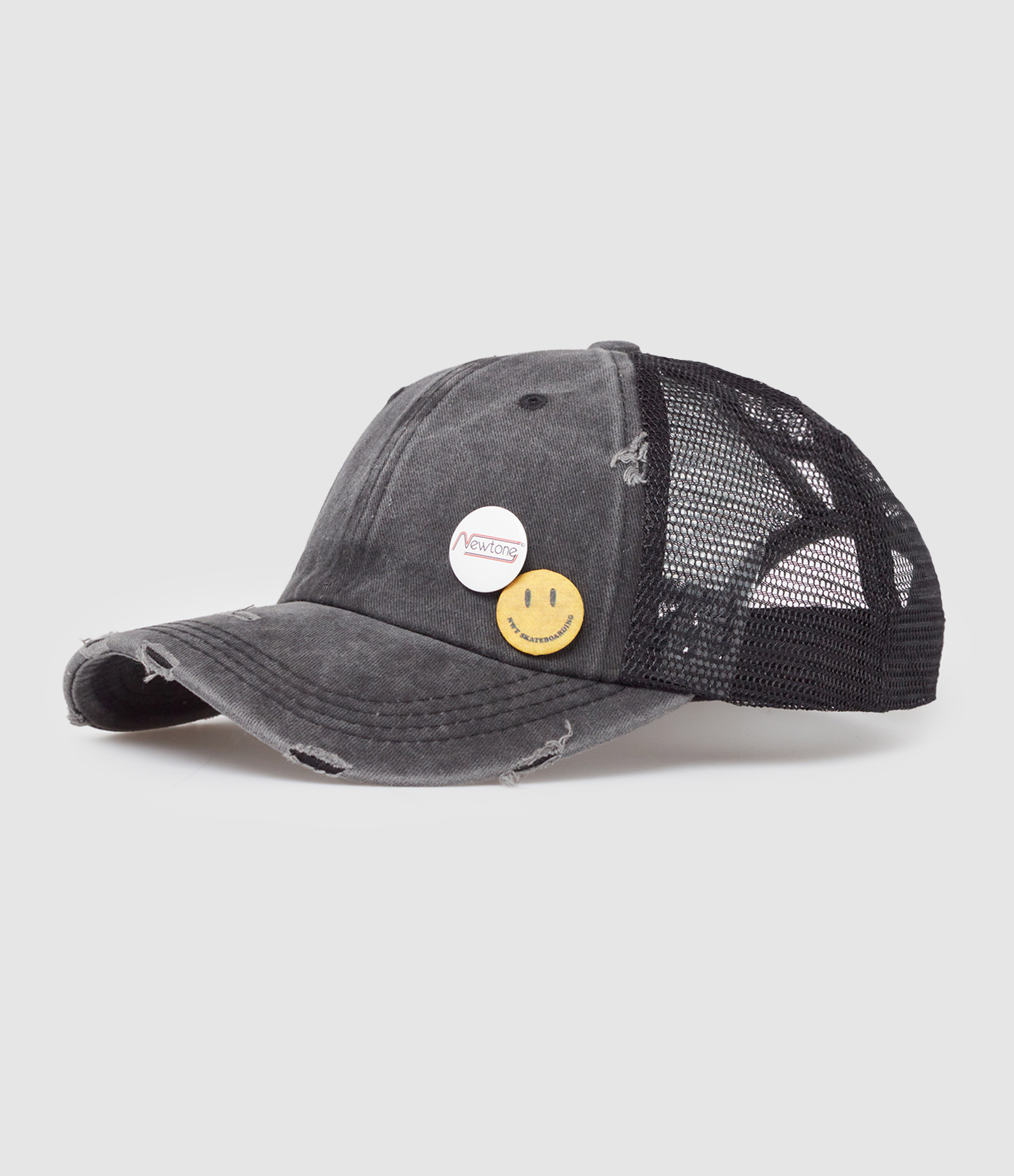 Casquette en coton gris volontairement usée, trois badges. Languette de réglage en scratch. Bande de propreté sur l'intérieur.