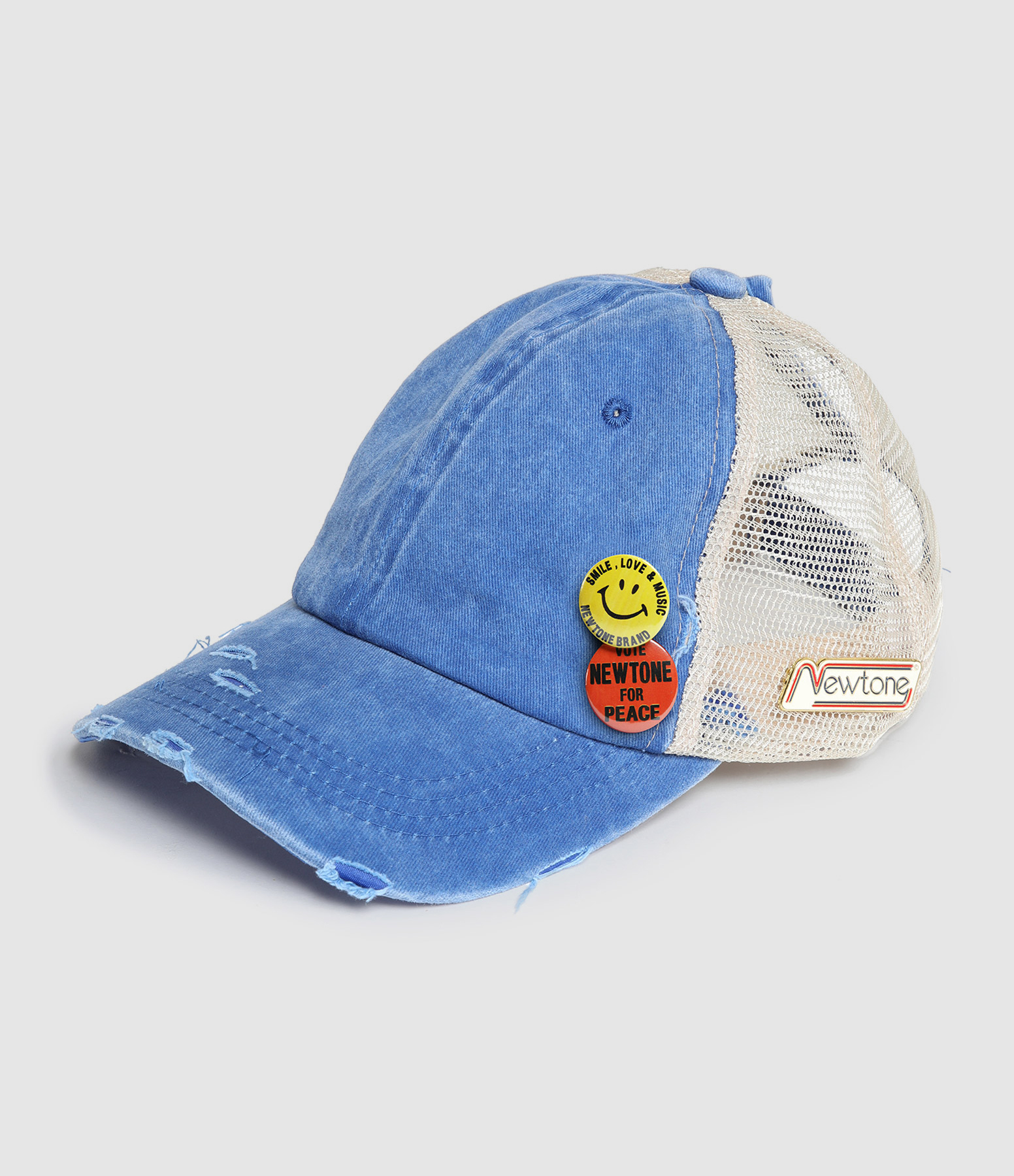 Casquette en coton bleu volontairement usée, trois badges. Languette de réglage en scratch. Bande de propreté sur l'intérieur.