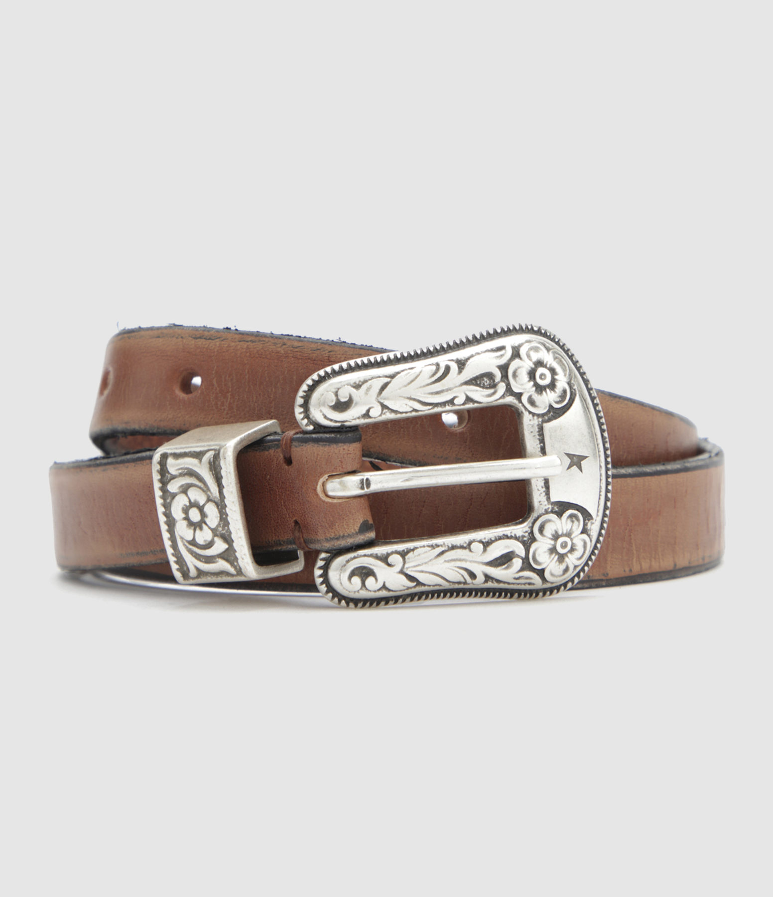 Ceinture en cuir marron. Fermoir boucle avec cinq positions.