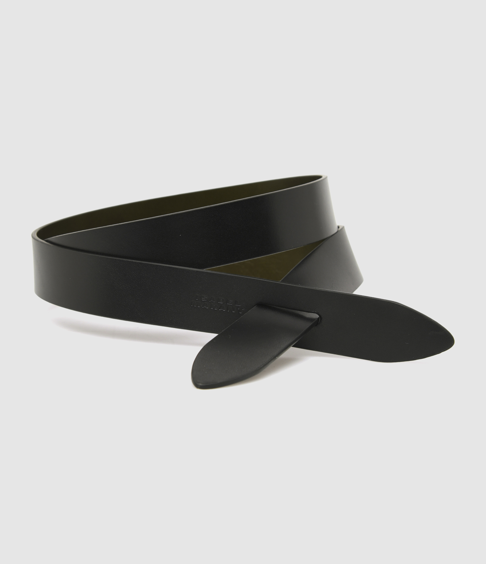Ceinture en cuir réversible noir et kaki. Fente pour faire passer l'extrémité et la nouer. Un côté noir, un côté vert foncé, à porter selon vos envies.