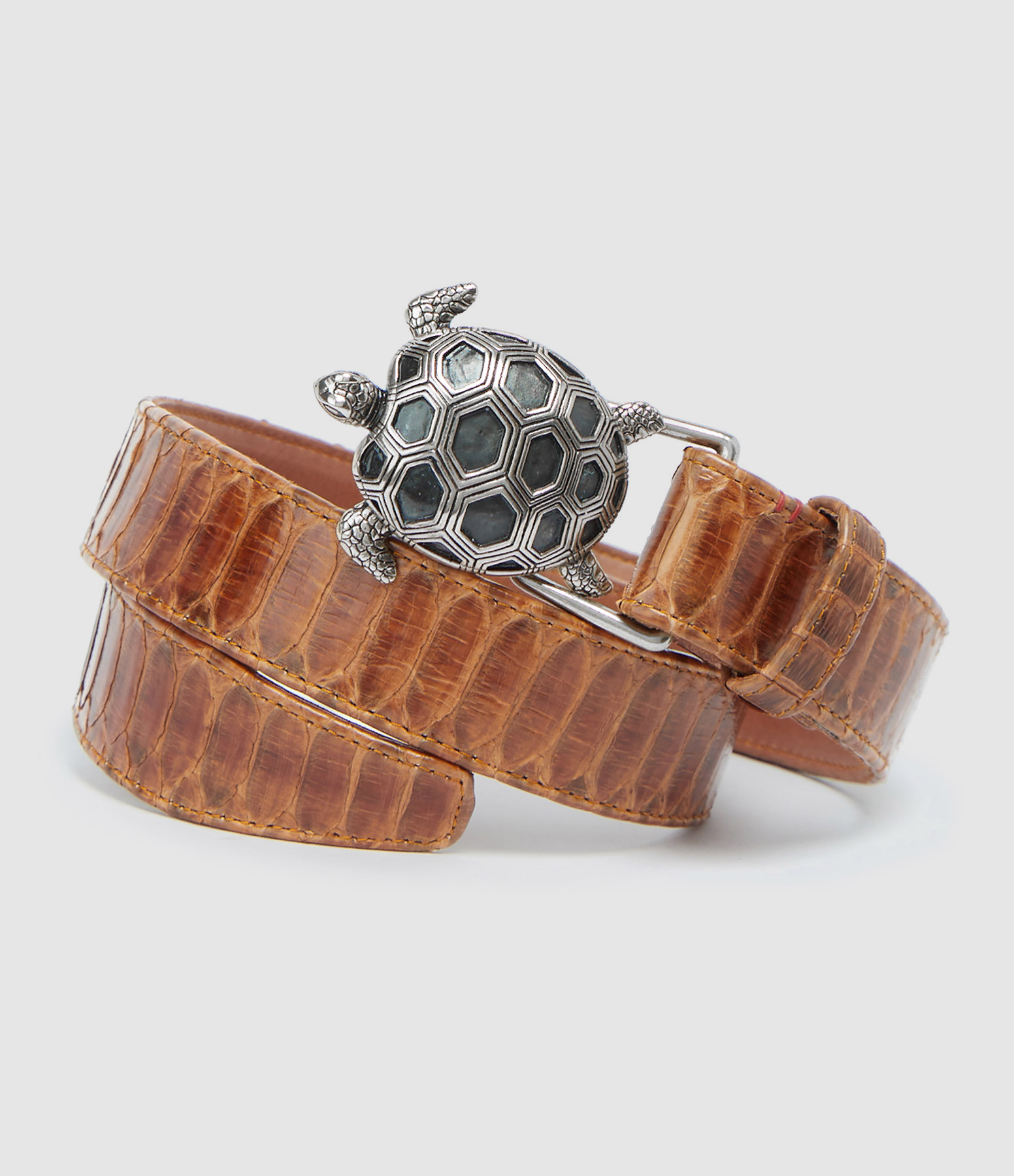 Ceinture pour femme en python marron et boucle tortue argentée. Doublée de cuir. Fermoir avec sept positions.